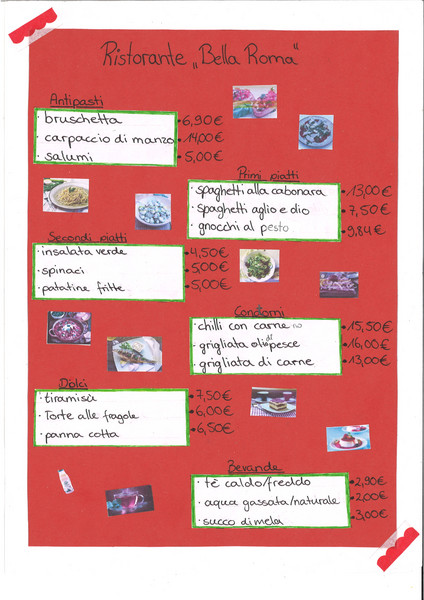 Zum Abschluss lassen die Lernenden ihrer Fantasie freien Lauf. Sie erfinden eigene italienische Restaurants, geben ihnen kreative Namen und gestalten individuelle Speisekarten, natürlich mit echten italienischen Gerichten und kleinen Zeichnungen.