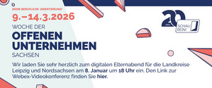als Schule legen wir besonderen Wert auf die berufliche Orientierung Ihres Kindes. Wir möchten den Schülerinnen und Schülern die Möglichkeit geben, im Rahmen der Initiative SCHAU REIN! - Woche der offenen Unternehmen vom 9. bis 14. März 2026 in Unternehmen im Landkreis Nordsachsen hineinzuschnuppern. Die Teilnahme ist für Ihr Kind freiwillig. Dabei handelt es sich um eine schulische Veranstaltung für die Klassenstufen 7 bis 11. Weitere Infos erhalten Sie hier...