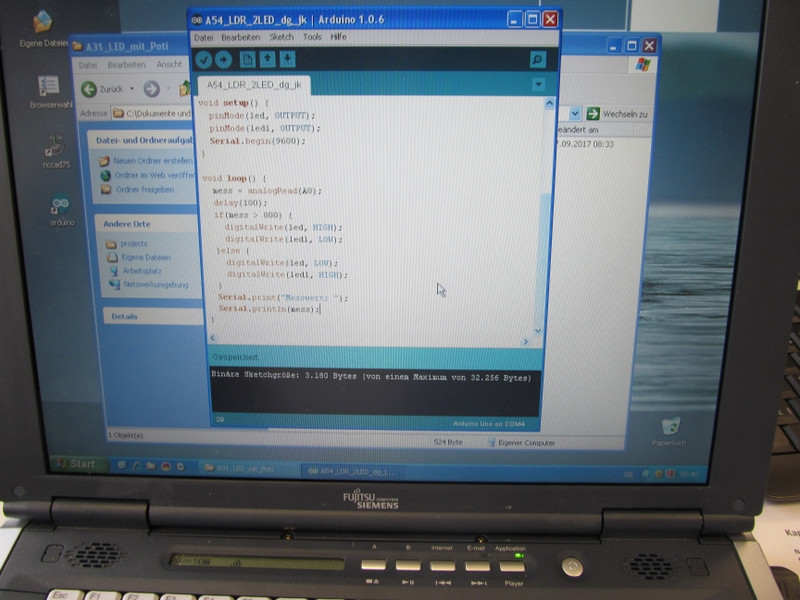 Zum Abschluss ersetzten wir das Potentiometer durch einen Fotowiderstand (Lichtsensor). Dazu musste natürlich wieder das Programm etwas angepasst werden.