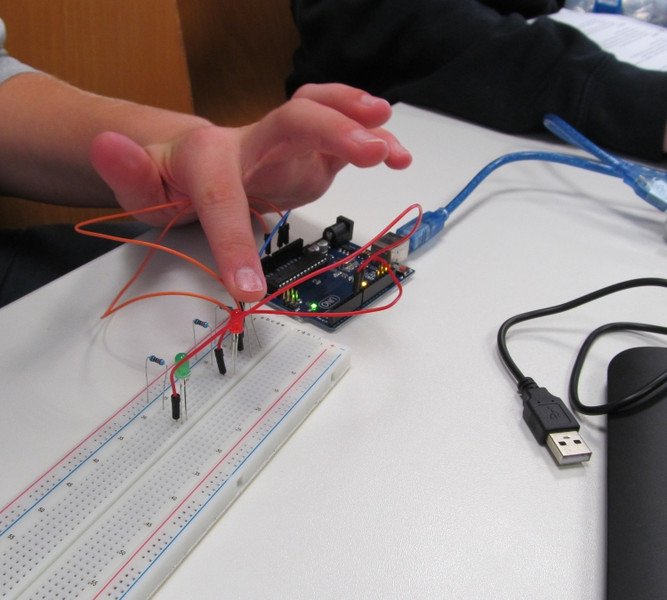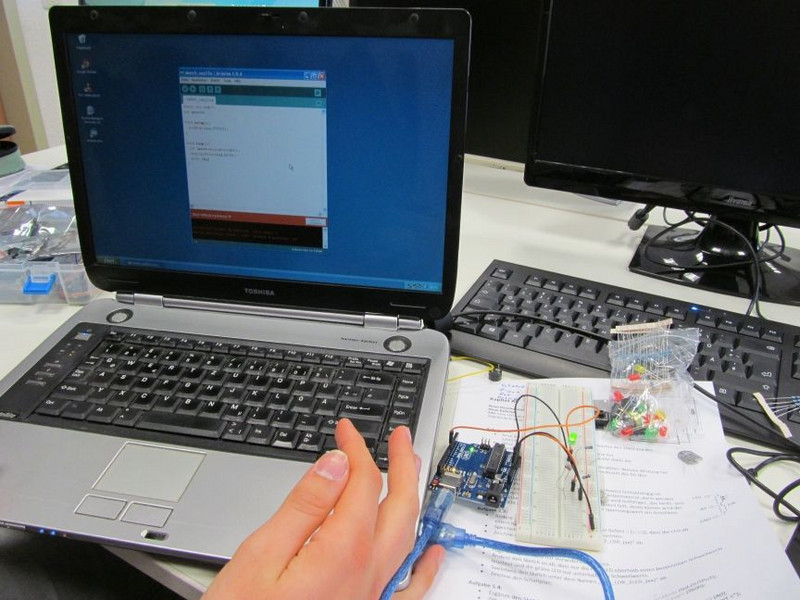 Heute kam die Steckplatine zum Einsatz. Mit ihr kann man auf einfache Art verschiedene Bauelemente und kleine Schaltungen an den Mikrocontroller anschließen. Über den Arduino ließen wir heute mehrere LEDs blinken. Auch die Reaktion des Sketches auf Tasteneingabe wurde ausprobiert.
