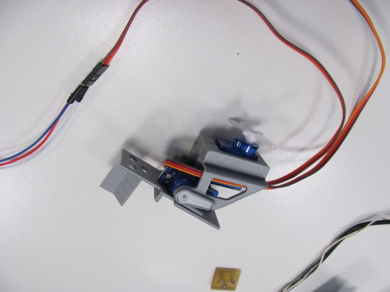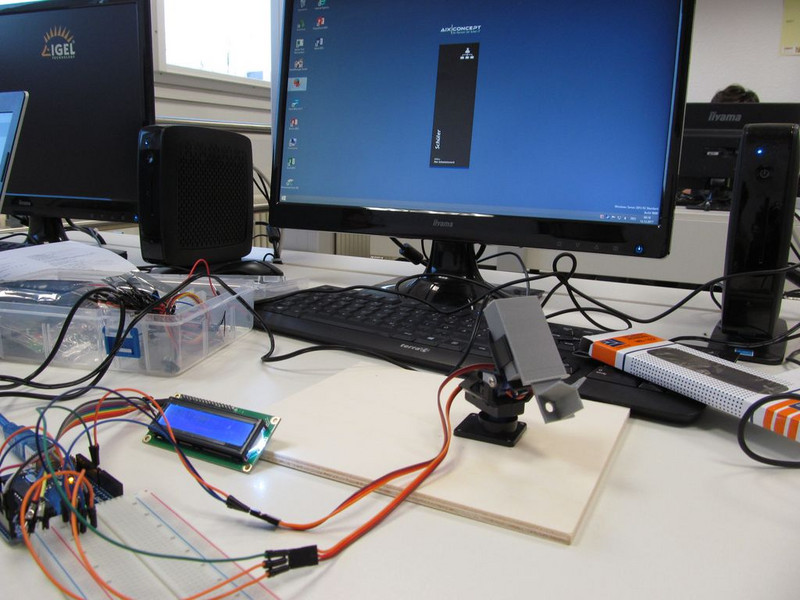Weiter ging es mit einem Servomotor. Im Gegensatz zum Schrittmotor, der seine Position über einen Schrittzähler ermittelt, bestimmt ein Servomotor seine Position über ein Potentiometer. Dadurch kann er auch nach mechanischen Blockaden seine Drehposition ermitteln. Ein Schrittmotor dagegen muss im Fehlerfall erst wieder auf die Nullstellung gefahren werden.