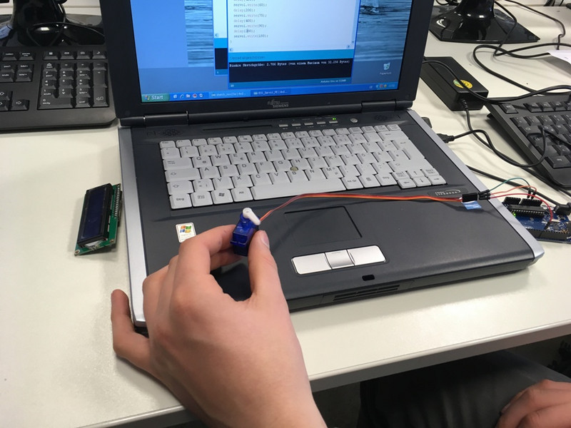 Bei der Programmierung konnten wir die Kenntnisse vom Schrittmotor anwenden. Am Anfang steuerten wir den Schrittmotor wieder digitale über Taster an. Später ersetzten wir die Taster durch Fotowiderstände als analoge Eingabe. Ziel war es, dass sich der Servomotor dreht, wenn ein LDR abgedunkelt wird.