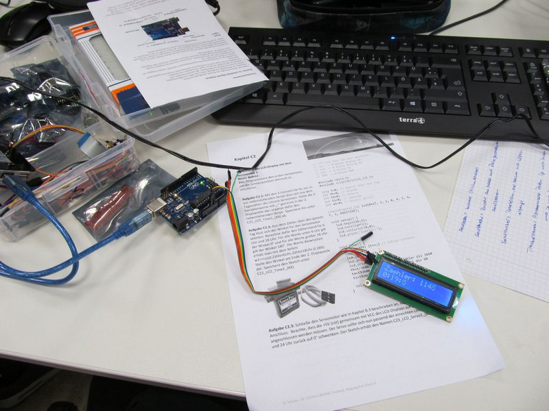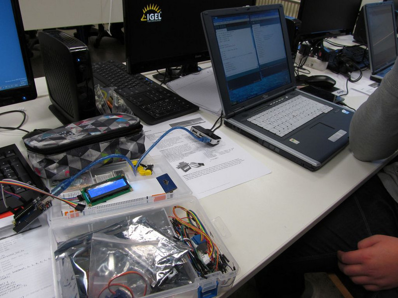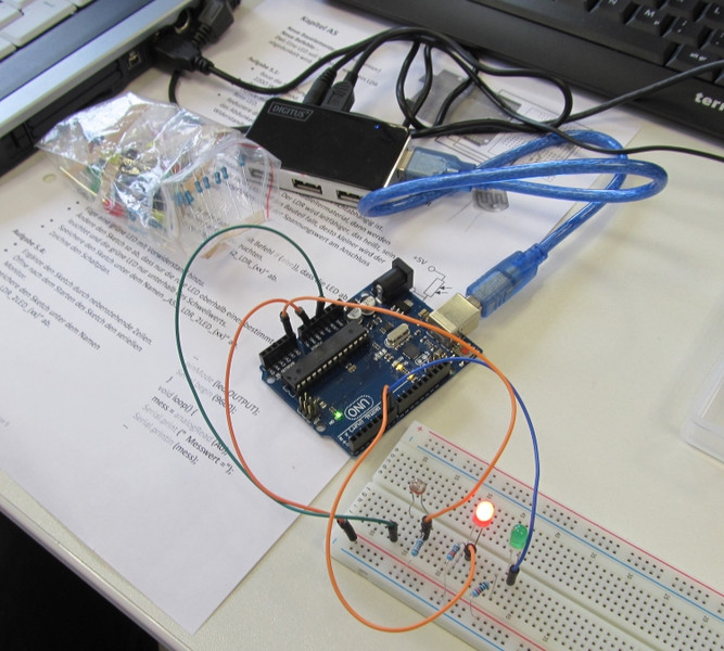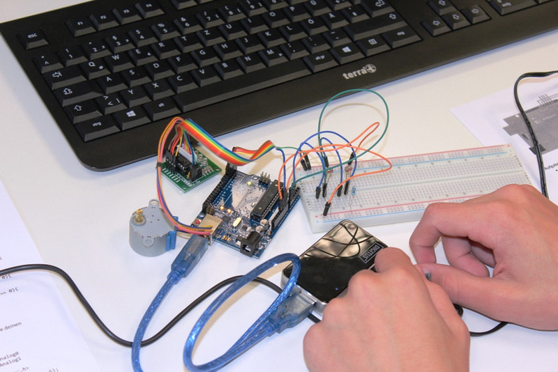In den Einführungsstunden erfuhren wir, wie man den Arduino über den Computer anspricht und die Software bedient. Den Grundaufbau des Arduino-Controllers lernten wir mit all seinen Anschlüssen kennen.