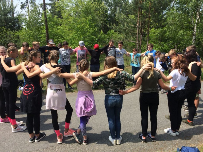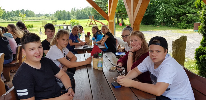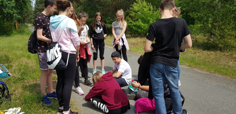 Gestartet sind wir, die Klasse 7b, mit Frau Ansorge und Herrn Holweger am 24.5 um 8:45 Uhr von Wittichenau aus in einen erlebnisreichen Tag. Wir sind mit dem Bus nach Halbendorf gefahren. Dort bekamen wir unsere Luch-Pakete und trafen die Klasse aus der tschechischen Stadt Semily. Dann teilten wir uns in zwei Gruppen auf und sind losgelaufen in den Wald Richtung Wartha. Mit dabei waren wieder zwei Dolmetscher. So konnten wir alles gut verstehen.