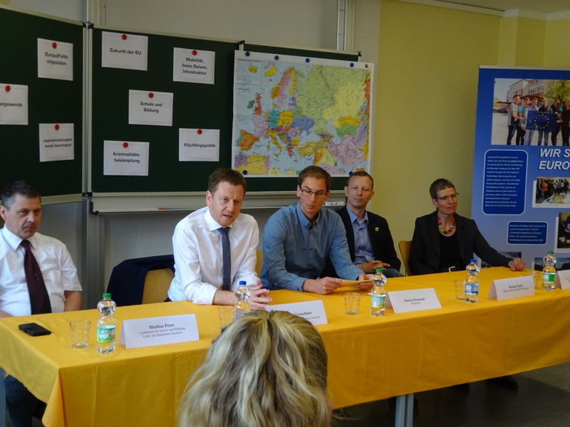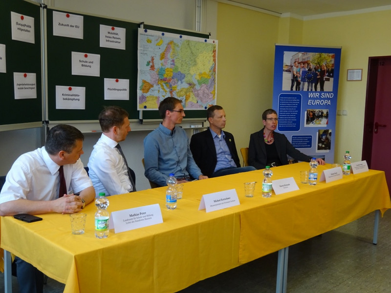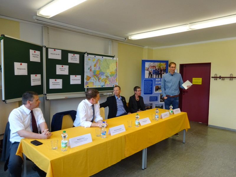 Unter Leitung von Herrn Martin Kliemank, der die Moderation übernahm, wurde über das Thema Europa – wir sind dabei – Europa kommt in die Schule - diskutiert. Einige Schüler unserer 9. Klassen nutzten die Möglichkeit, Fragen, die sie bewegen, an die Teilnehmer der Diskussionsrunde zu stellen. Vielfältige Themenbereiche wurden angesprochen wie zum Beispiel die Problematik Berufsvorbereitung - Berufsauswahl – Berufsausbildung, Seiteneinsteiger an Schulen, sowie die Themen Umwelt und Zukunft.