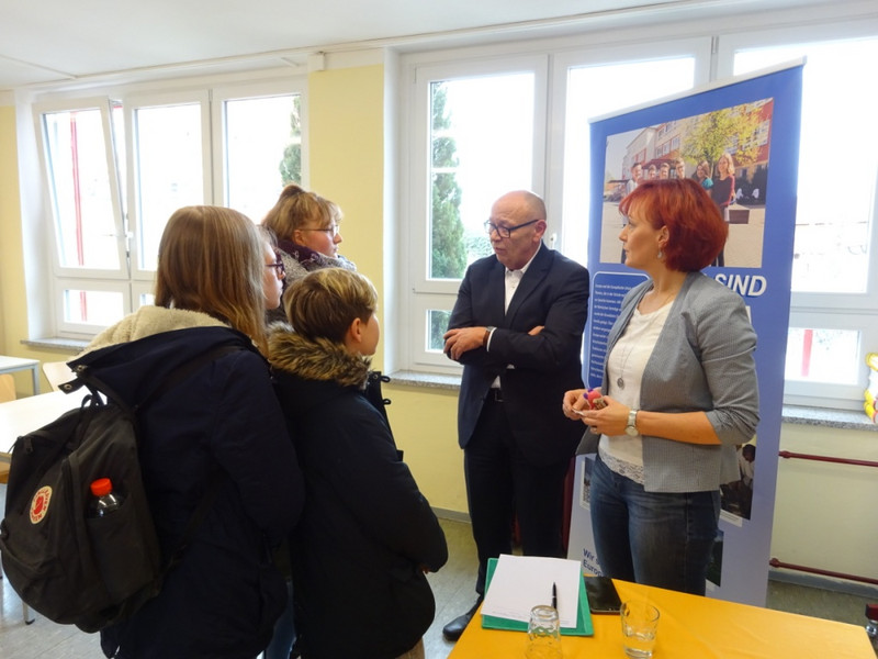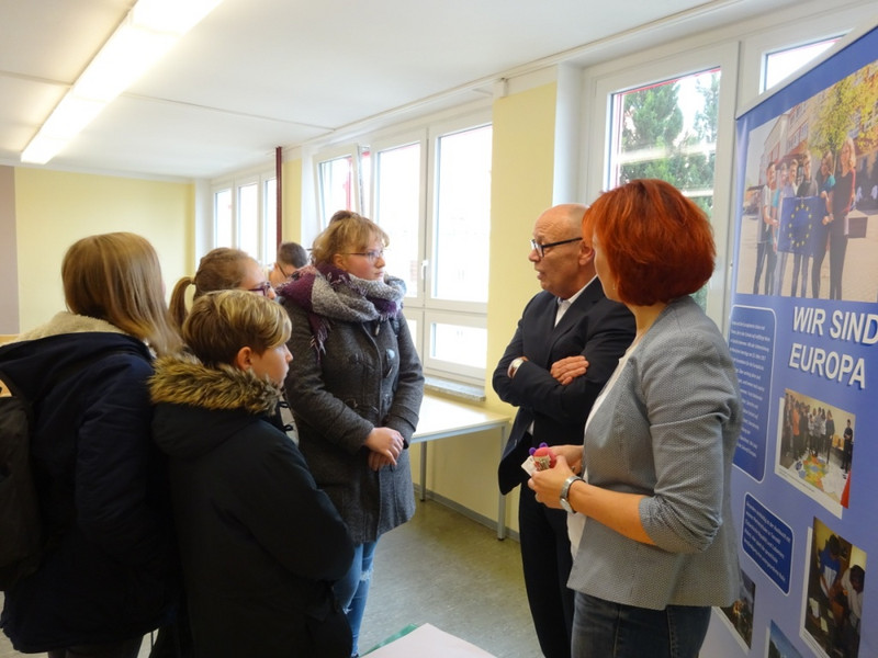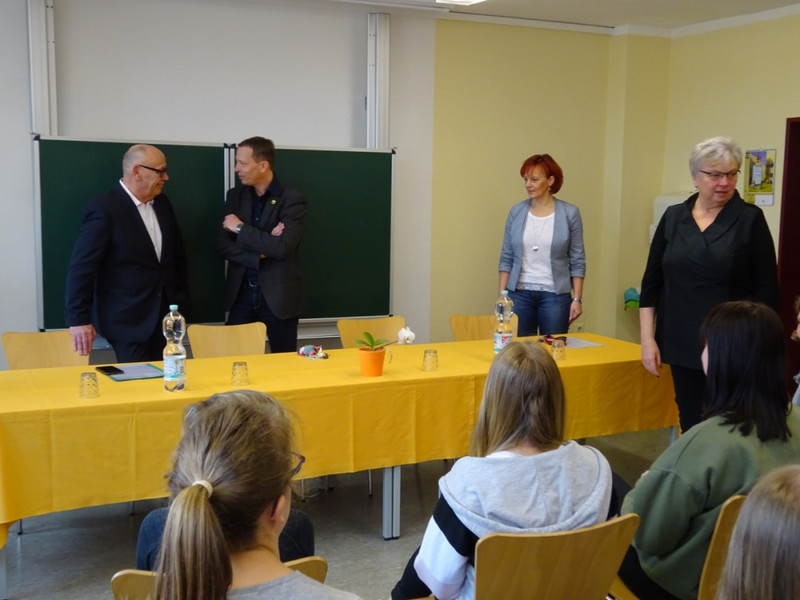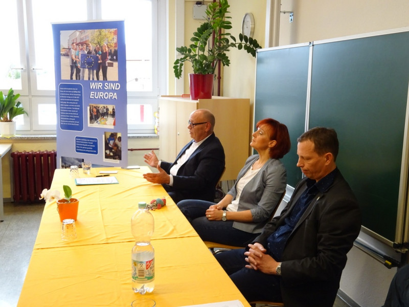 Es wurde über das Thema Europa – wir sind dabei – Europa kommt in die Schule - diskutiert. Einige Schüler unserer 9. Klassen nutzten die Möglichkeit, Fragen, die sie bewegen, an die Teilnehmer der Diskussionsrunde zu stellen. Vielfältige Themenbereiche wurden angesprochen wie zum Beispiel die Problematik Umweltschutz, die Erforschung und der Einsatz neuer Technologien im Bereich der Autoindustrie oder das Urheberrecht. Nach der 90-minütigen Gesprächsrunde nutzen einige Schüler noch die Möglichkeit, individuelle Fragen an den Staatssekretär zu stellen.