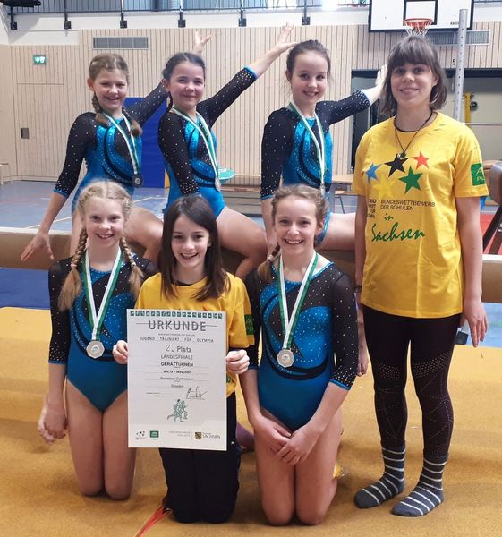 Am 21.03.19 fand in Lossatal das Landesfinale im Gerätturnen in der WK IV statt. Wochenlang übten unsere Turnerinnen Hannah Hellwig, Lena Marie Ziesch, Sarah Janina Baars (alle 6/1), Finja Wolke Reißig (6/2) und Franka Ottlinger (5/2) mit viel Fleiß die ungewohnten Gerätebahnen und die Athletikstationen dieses Wettkampfes. Unsere Mädchen turnten einen guten Wettkampf. Besonders hervorzuheben war die Synchronität an der Gerätebahn C bei den Schattenrollen, Hockwenden und Paarübungen, für die wir die Höchstnote erhielten. Strahlend nahm unser Team zur Siegerehrung die verdiente Silbermedaille in Empfang.