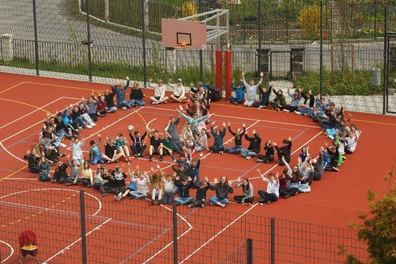 Am Dienstag, dem 26.04.2022, fand eine Aktion nach der sechsten Stunde auf unserem Sportplatz statt. Um auf unsere Aktion aufmerksam zu machen, hing schon einige Wochen vorher ein Hinweis in Form eines Plakats aus. Wir, die Schülerinnen der Klasse 9/2 und unser Klassenlehrer Herr Groth, hatten geplant, ein Peace-Zeichen aus Schülerinnen und Schülern unserer Schule zu bilden, als Zeichen für den ersehnten Frieden zwischen Russland und der Ukraine. Außerdem wollen wir mit diesem Foto ein generelles Zeichen für Frieden setzen, aber auch unsere Loyalität gegenüber der Ukraine ausdrücken. Dabei stand für uns der symbolische Aspekt im Vordergrund. Trotzdem fand vor dem Unterrichtsbeginn zusätzlich eine Spendenaktion statt, bei der wir zusätzlich 90,44 € zu der letzten Spendenaktion unserer Schule eingenommen haben. Es haben auch zahlreiche Schülerinnen und Schüler an dem Projekt teilgenommen, darunter vor allem die Teilnehmer der Basketball- und Fußball-AG, bei denen wir uns noch einmal herzlichst für ihre engagierte Teilnahmebereitschaft bedanken.