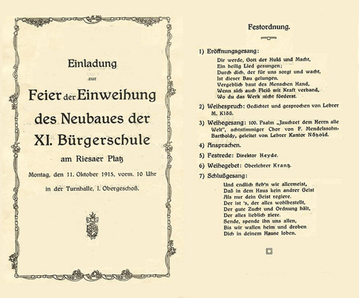 Auf der Wurzener Straße befand sich die XI. Bürgerschule. Das Gebäude besteht noch heute als Ärztehaus. Die beengten Verhältnisse machten in diesem Fall einen Neubau notwendig. Dieser erfolgte am Rande Pieschens am Riesaer Platz (heute Pestalozziplatz) an der Kreuzung der Kanonenstraße (heute Weinböhlaer Straße) und der Großenhainer Straße weithin von immer noch landwirtschaftlich genutzten Flächen umgeben. Als Architekt fungierte Stadtbaurat Erlwein, der bis dahin schon mit bekannten Bauwerken die Dresdner Architekturlandschaft an vielen Stellen geprägt hatte. Diese Schule sollte das letzte seiner verwirklichten Projekte werden. Die Übergabe am 11. Oktober 1915 konnte er nicht mehr selbst erleben.