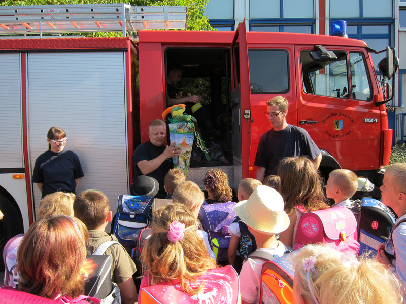 Nach der feierlichen Aufnahme und dem Einzug mit ihrer Klassenleiterin ins Klassenzimmer freuten sich die „Neuen“ auf ihre Zuckertüten, die traditionell von der Freiwilligen Feuerwehr Lindenthal mit lautem Sirenenton gebracht und auch überreicht wurden. Herzlichsten Dank an dieser Stelle den Kameraden.