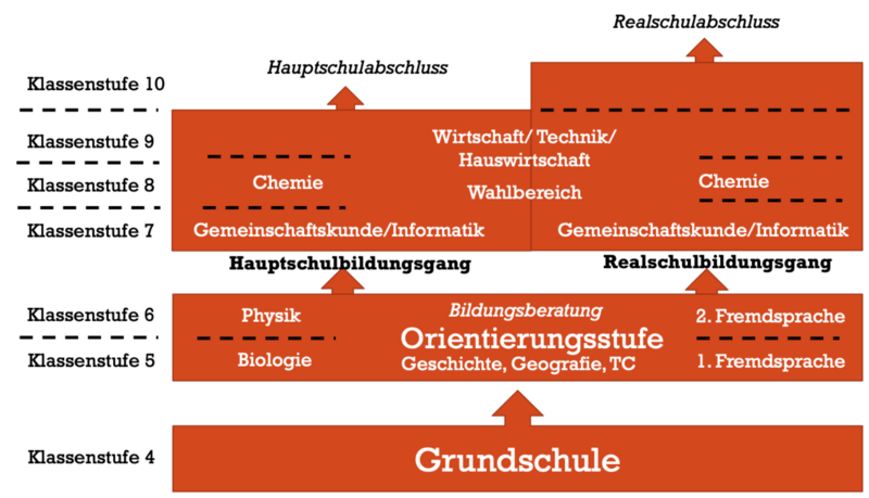 Die Klassenstufen 5 und 6 stellen eine Orientierungsstufe dar, ab Klassenstufe 7 arbeiten die Schülerinnen und Schüler abschlussbezogen im Haupt- bzw Realschulbildungsgang bis Klassenstufe 9 bzw. 10.