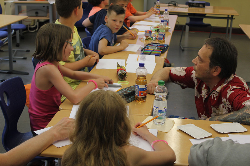 Nach einem sehr anschaulichen Vortrag zur Handwerkszunft der Zimmerleute von Herrn Herr Olav Petersen (Bauhütte Ost), starteten die vier sehr gut besuchten Projekte "Wie entsteht ein Comic", "Vom Buch zum Film", "gemeinsam lesen" und "Schreiben ist nichts für Feiglinge". Bei kleinen Snacks wurde gelesen, gezeichnet, mit Texten experimentiert und Text und Bild analysiert. Die Letzten verließen erst nach 22:00 Uhr das Haus.