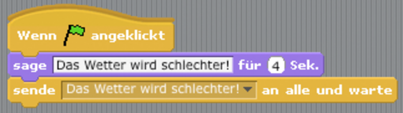Senden, Empfangen und Reagieren ist ein grundlegendes Konzept von scratch. Dabei können Sprites Nachrichten in Form von Text "an alle" aussenden. Die gesendete Nachricht wird von einzelnen Sprites empfangen. In Abhängigkeit von den Nachrichten werden verschiedene Reaktionen ausgelöst.