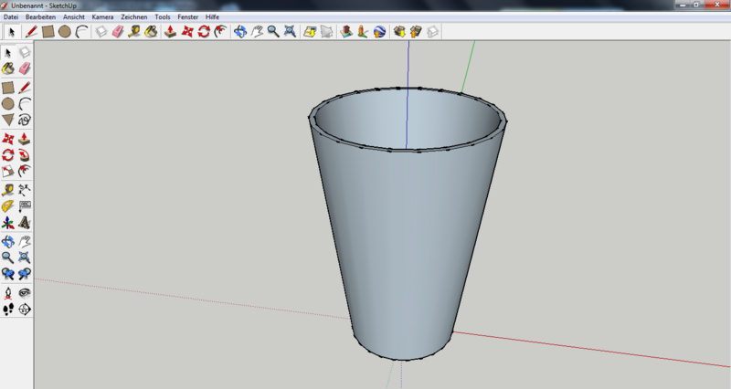 Man markiert die Kreisfläche, drückt auf das "Folge mir" Werkzeug und mit der Spitze des Werkzeuges klickt man in die Senkrecht stehende Fläche. So entsteht der Becher. Der Kreis am Boden kann nun entfernt werden.