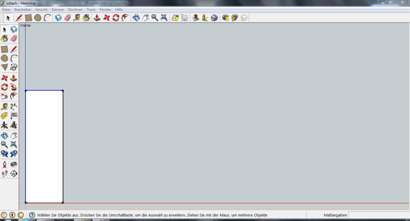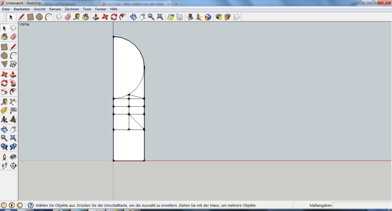 Jetzt ziehen sie einen Strich vom unteren Punkt des Rechtecks waagerecht zur blauen Grundlinie. Von dem Mittelpunkt dieser Geraden zeichnen sie dann einen Strich nach oben bis zum oberen Linie die das Rechteck unterteilt. Nun teilen sie das Drittel in mit in zwei Hälften mit hilfe einer Linie.