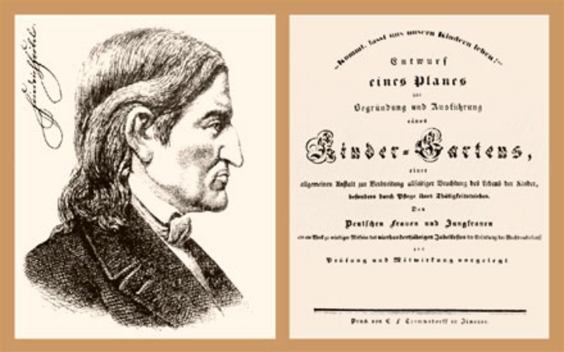 1805 entschied sich Fröbel für den Erzieherberuf und er wurde Lehrer an einer Musterschule in Frankfurt am Main. Danach ging er in die Schweiz, hospitierte, lernte und lehrte bei Pestalozzi in Iferten. 1817 gründete Fröbel im thüringischen Keilhau die "Allgemeine Deutsche Erziehungsanstalt". Hier arbeitete er an vielen pädagogischen Schriften und seinem Hauptwerk "Die Menschenerziehung". Sein Ziel war es, "freie, denkende, selbsttätige Menschen" zu bilden! Während seiner Erziehertätigkeit in einem Waisenhaus in der Schweiz erkannte er, daß die Bildung der Kinder bereits im Vorschulalter erfolgen muß.