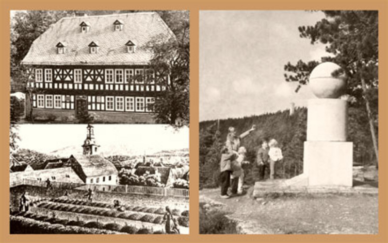 Gegenüber vom Marktplatz in in Oberweißbach (Thüringen) befindet sich ein über 400 Jahre altes, denkmalgeschütztes Fachwerkhaus. Hier wurde am 21. April 1782 Friedrich Wilhelm August Fröbel als 6. Kind des damaligen Pfarrers Johann Jacob Fröbel geboren. Auf Wunsch des Vaters besuchte er als einziger Knabe des Ortes die Mädchenschule. Für den zehnjährigen Fröbel war es ein glücklicher Umstand, als ihn sein Onkel mit nach Stadtilm nahm. Mit 15 Jahren kehrte Fröbel in sein Elternhaus zurück. Es folgten Lehrjahre in der Land- und Forstwirtschaft sowie zwei Studienjahre der Naturwissenschaften an der Universität in Jena. 1801 rief ihn sein erkrankter Vater noch einmal nach Oberweißbach zurück, doch bereits ein Jahr später, nach dessen Tod, verließ Fröbel entgültig seinen Heimatort.
