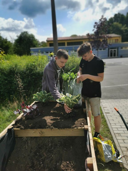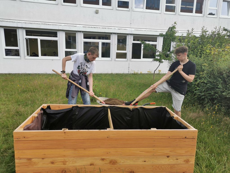 Die Schüler der Klasse H9 (Schuljahr 2019/2020) verschönerten im Rahmen der Komplexen Leistung den Eingangsbereich mit zwei Hochbeeten.