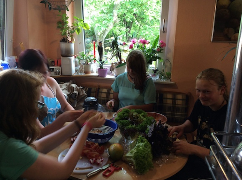Vorher aber hieß es wieder Kräuter zu sammeln, gemeinsam in der Küche die Speisen zuzubereiten, Iffi auszuführen und ein paar freundliche Nachbarn um leckere Kirschen zu bitten, die sie uns tatsächlich in ihrem Garten pflücken ließen! Mit Freundlichkeit und dem Mut zu fragen, statt einfach Kirschen zu klauen, kommt man eben viel weiter. Auch das haben wir gelernt!
