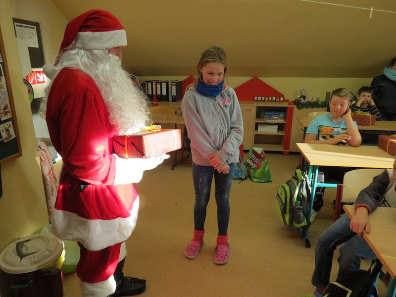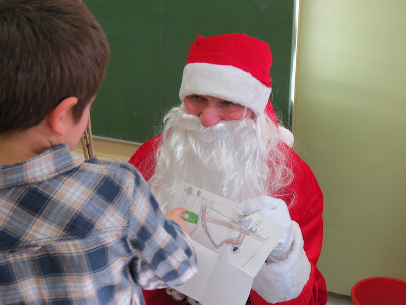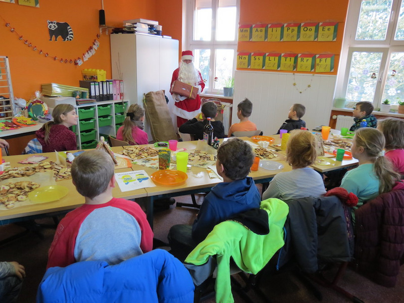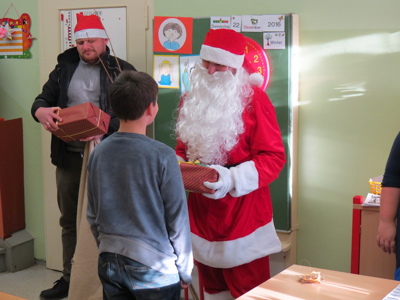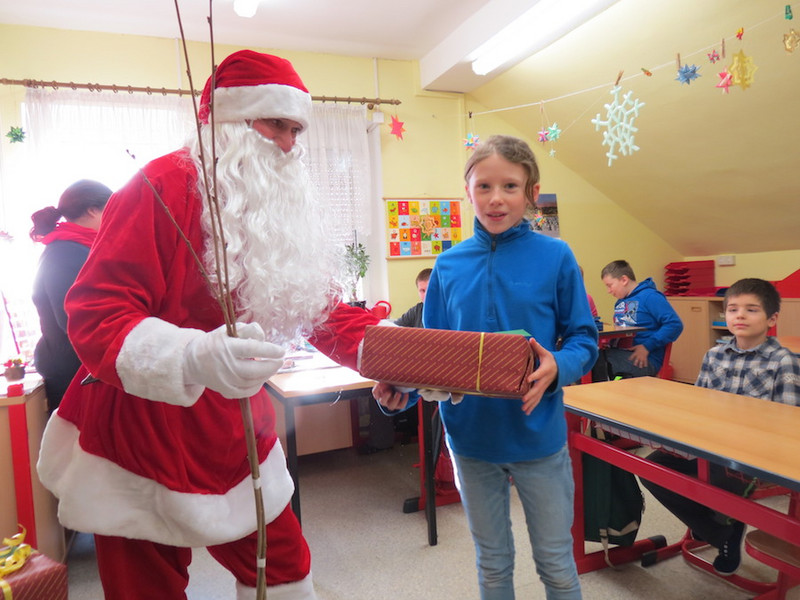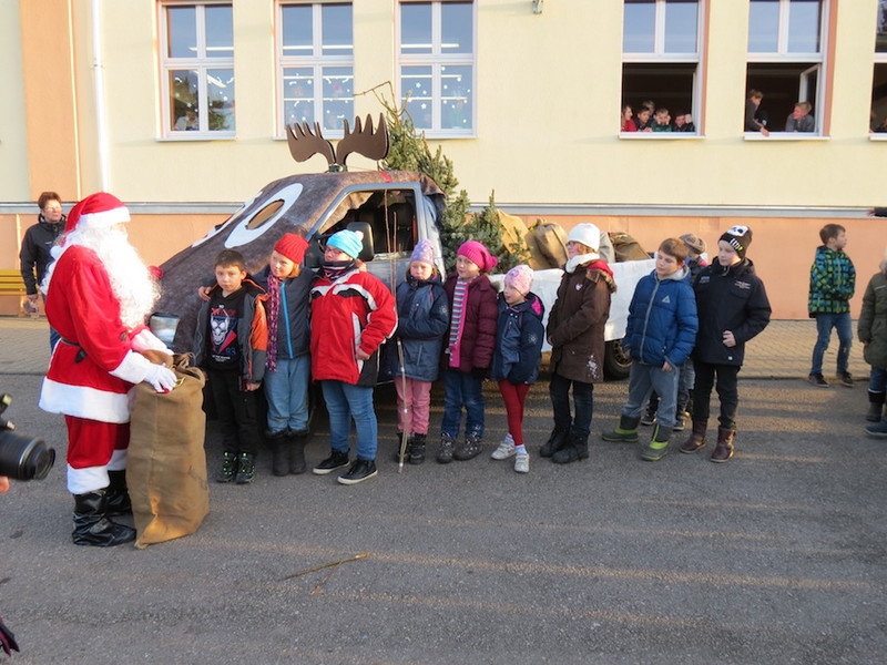 Am letzten Schultag dieses Jahres besuchte der Weihnachtsmann, seine Wichtel-Helfer und sein motorisierter Elch unsere "kleinen" Kinder, von denen alle Schüler der Klassen 1 bis 4 ganz begeistert ihre Geschenke von ihm in Empfang nahmen und ihm mit Liedern, Gedichten und sogar selbst gemalten Bildern dankten!