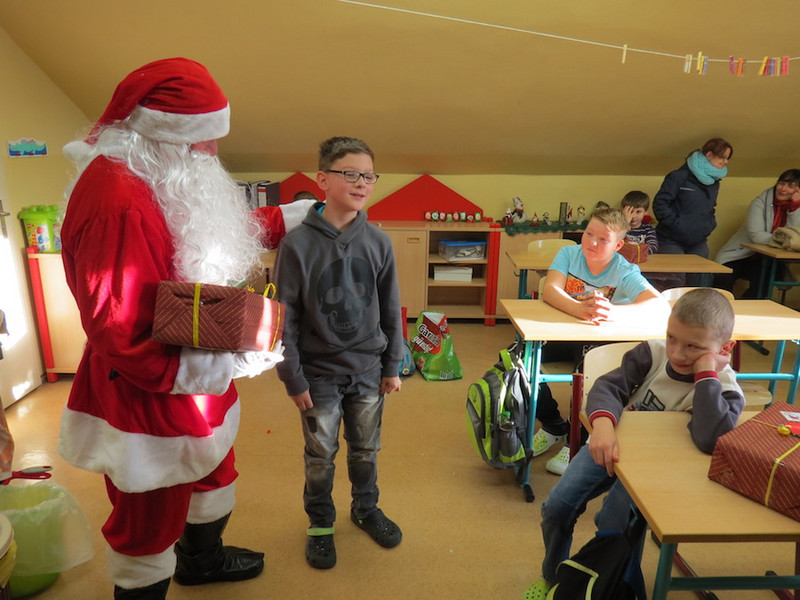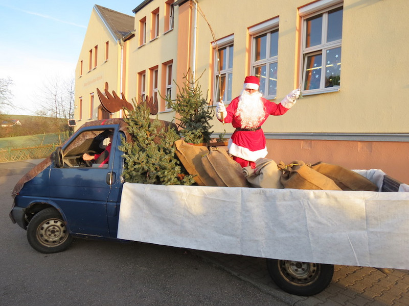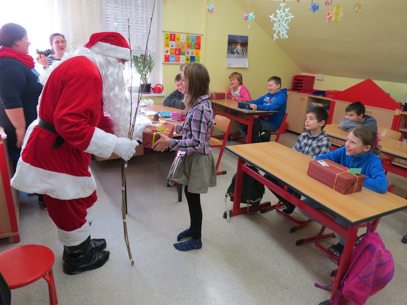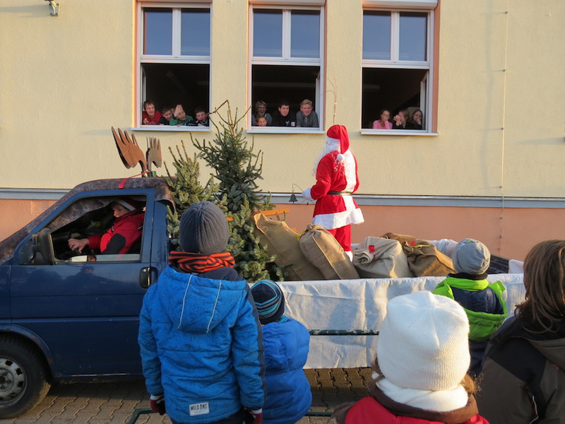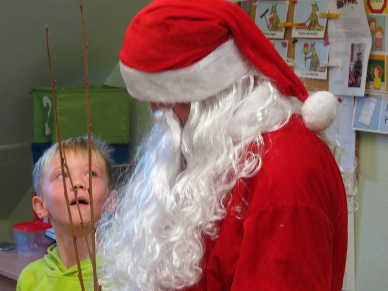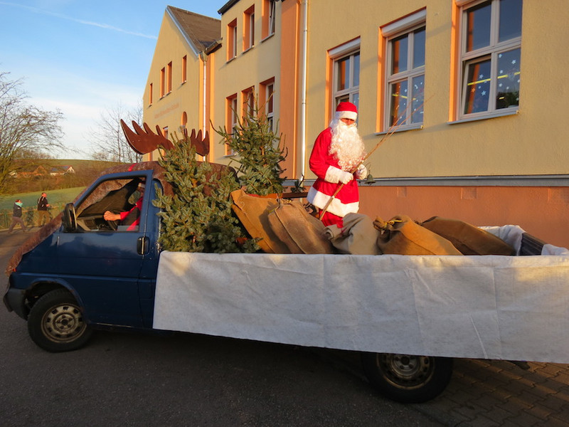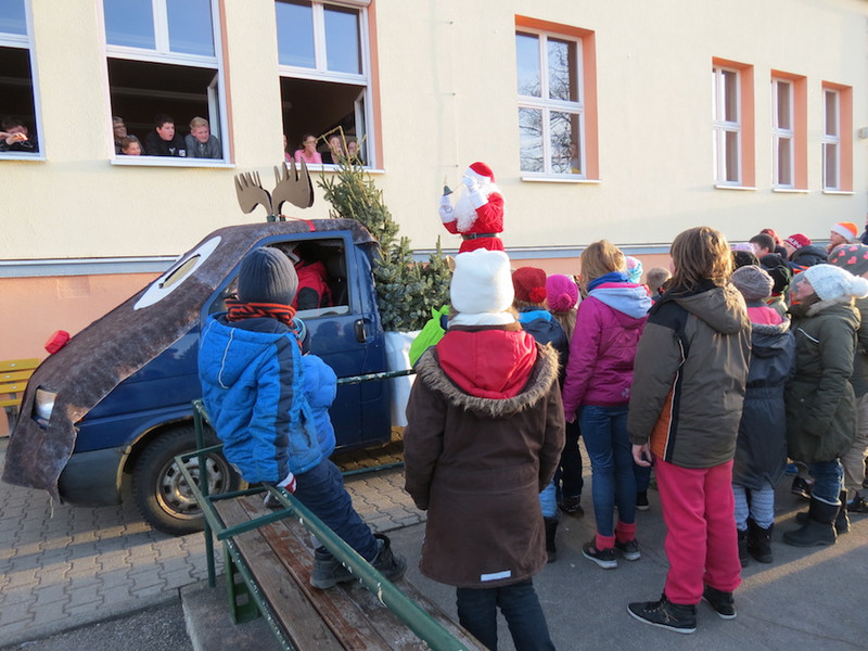 Am letzten Schultag dieses Jahres besuchte der Weihnachtsmann, seine Wichtel-Helfer und sein motorisierter Elch unsere "kleinen" Kinder, von denen alle Schüler der Klassen 1 bis 4 ganz begeistert ihre Geschenke von ihm in Empfang nahmen und ihm mit Liedern, Gedichten und sogar selbst gemalten Bildern dankten!