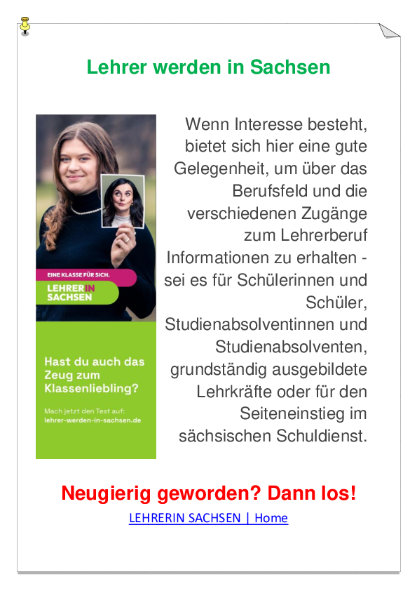 Wenn Interesse besteht, bietet sich HIER eine gute Gelegenheit, um über das Berufsfeld und die verschiedenen Zugänge zum Lehrerberuf Informationen zu erhalten - sei es für Schülerinnen und Schüler, Studienabsolventinnen und -absolventen, grundständig ausgebildete Lehrkräfte oder für den Seiteneinstieg im sächsischen Schuldienst.