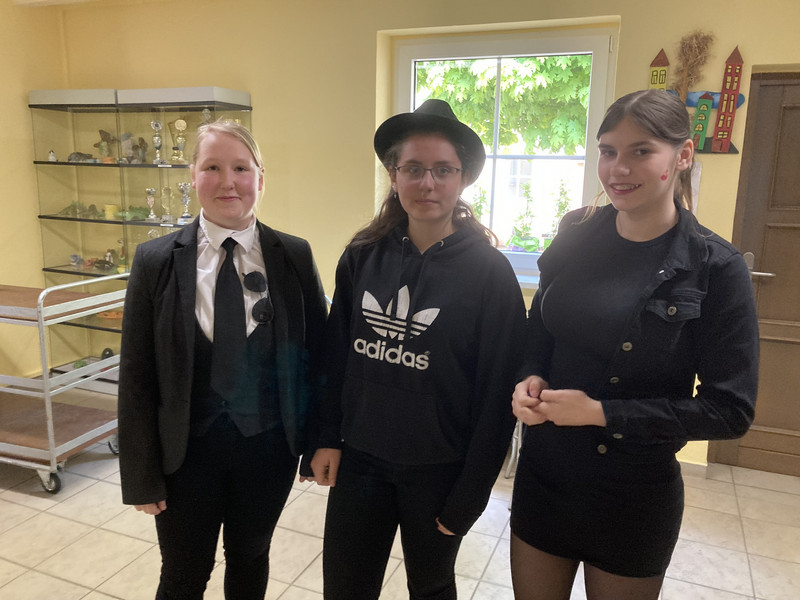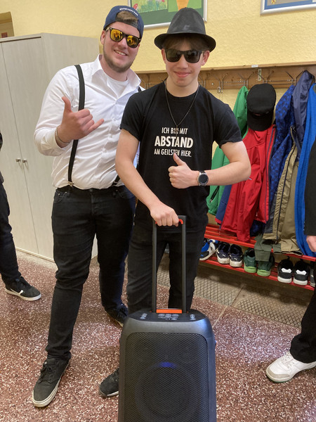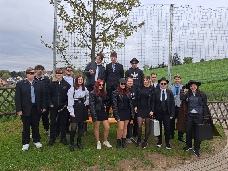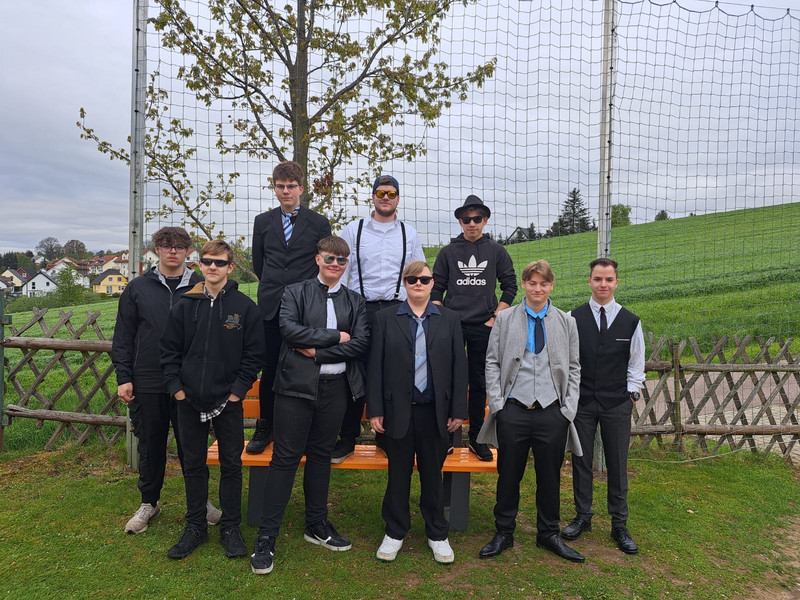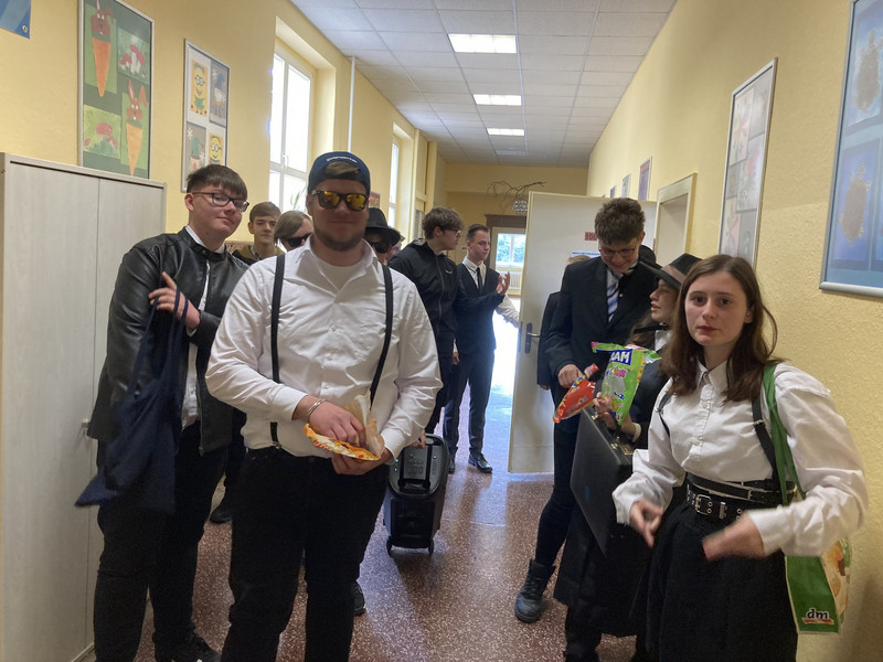 Unter dem Motto "Mafia" kamen alle jungen Damen und Herren elegant in Schwarz und Weiß, bedankten sich bei ihrer Klassenlehrerin und stellvertretenden Klassenlehrerin mit einem Lied und wunderschönen Rosen für die zurückliegende schöne Zeit und feierten anschließend mit Musik, Kamelle und Pizza.