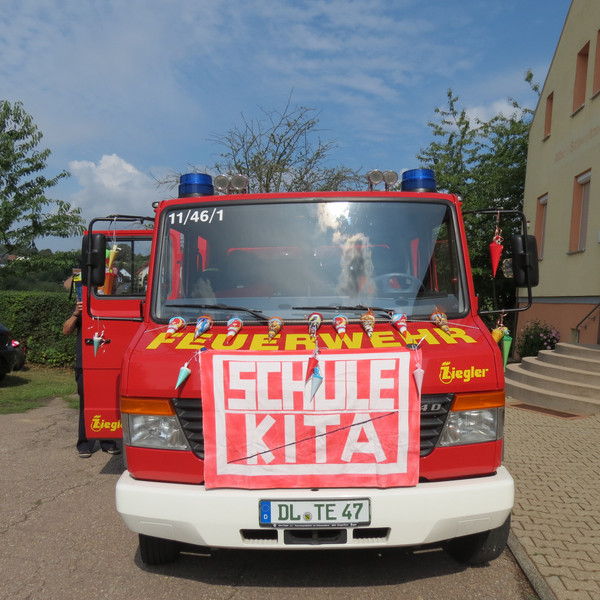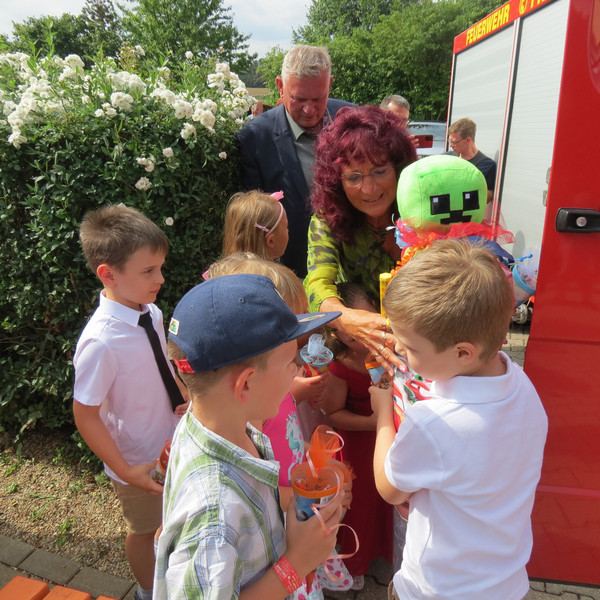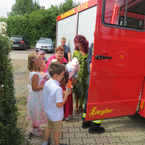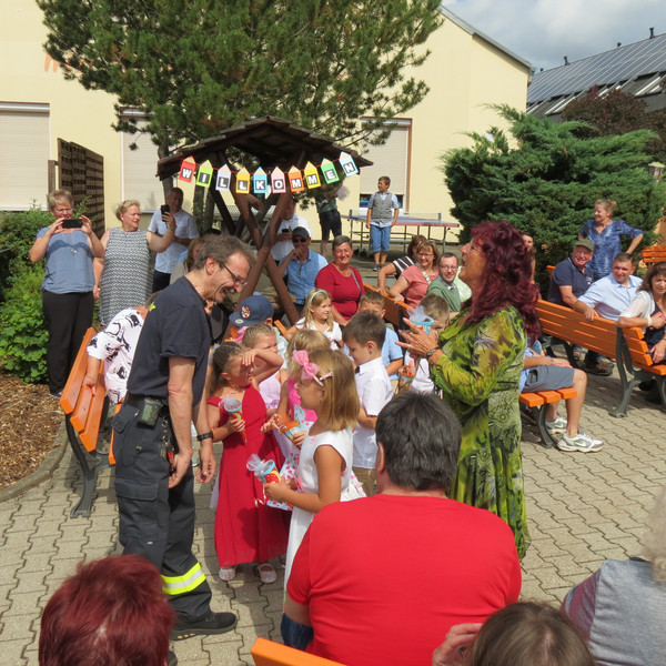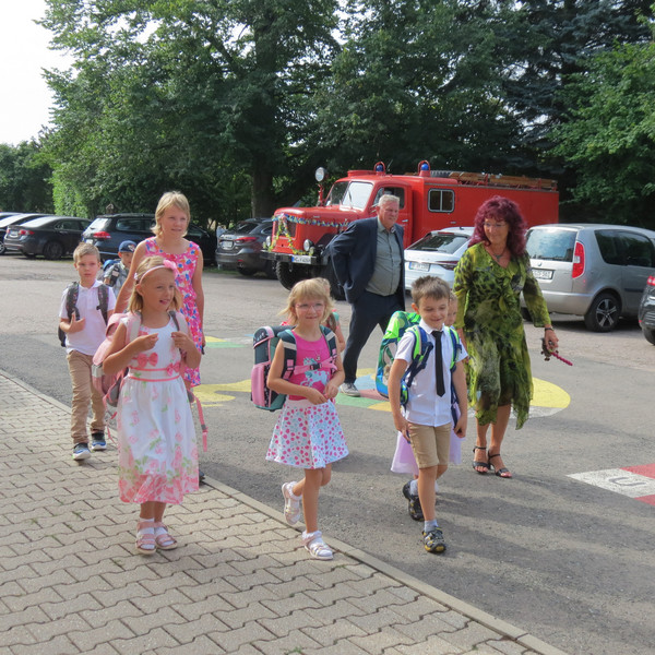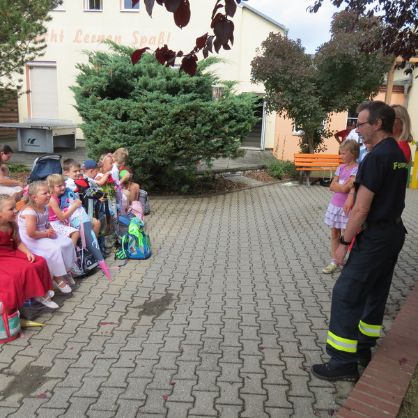Stillsitzen fällt ja sehr schwer, deshalb gab es für unsere „Neuen“ erst noch einmal Bewegung, denn auf dem Taxiplatz wartete schon der Roßweiner Spielmannszug. Mit Musik und dem Beifall der Gäste marschierten die Kinder nun offiziell zu ihren Plätzen. Ein herzliches Dankeschön den Mitgliedern des Roßweiner Spielmannszuges für die musikalische Untermalung! Es folgte der erste Programmteil der „Großen“, bevor unsere Schulleiterin Frau Gründel alle Anwesenden herzlich begrüßte und ins Gespräch mit den Schulanfängern kam. Gleichzeitig wurden die anwesenden Lehrer und Erzieher unserer Schule vorgestellt. Im Gespräch stellten die Kinder fest, dass die Zuckertüten am Baum schon ziemlich klein sind und so gar nicht den Erwartungen entsprachen! Eine Geschichte und kräftiges Gießen sollten Abhilfe schaffen. Da ja nichts ganz schnell wächst, gingen die Kinder mit ihrer Klassenlehrerin zunächst einmal in ihr Klassenzimmer. Sie staunten, was da alles für sie bereit lag und in den Ranzen gepackt werden durfte! Auch eine Zuckertüte war dabei – einige meinten, die würde schon reichen. Aber es war noch nicht die „Elterntüte“, sondern ein Geschenk der NETTO-Handelskette. Mit dem Klassenfoto bedanken wir uns ganz herzlich bei NETTO und Herrn Niezold vom Förderverein unserer Schule. Als die Kinder wieder auf dem Hof Platz genommen hatten, entdeckten sie im Strauch eine große Zuckertüte – aber NUR EINE! Es werden doch aber 7 gebraucht! Was tun? Es war ein Notfall – und in Notfällen kann man die Feuerwehr anrufen. Diese kam auch binnen kurzer Zeit mit lautem Tatütata. Die Freude war groß, als die Kinder hörten, dass man unterwegs wohl verloren gegangene Zuckertüten gefunden hatte! Nach noch einer kleinen Tüte von der Feuerwehr für die Kinder, konnten sie endlich ihre grooooßen und liebevoll gepackten Zuckertüten in Empfang nehmen. Wir bedanken uns ganz herzlich bei Herrn Peter und der Feuerwehr Lüttewitz für die Unterstützung beim Auffinden und Verteilen der Zuckertüten!