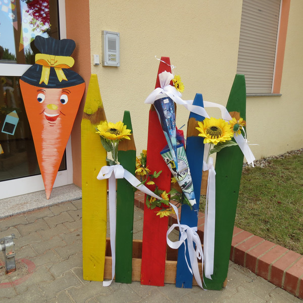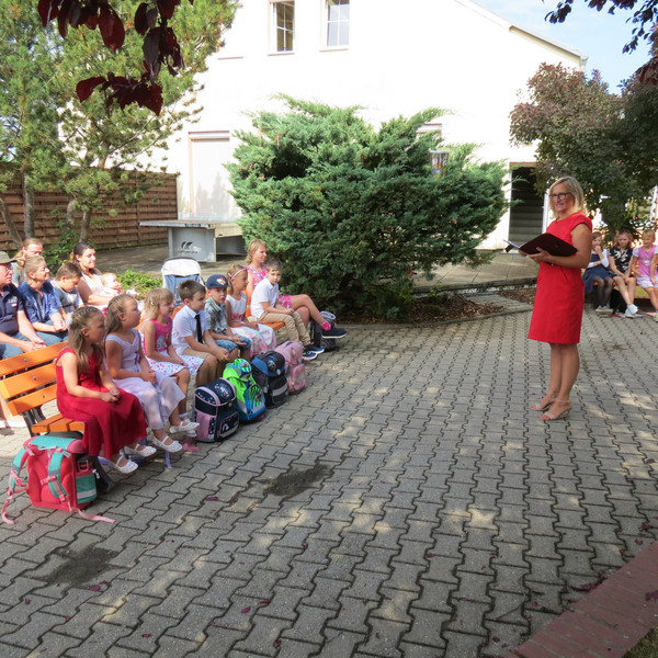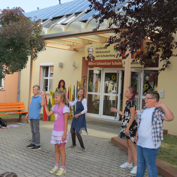Doch zuvor wurden sie feierlich auf ihren neuen Lebensabschnitt eingestimmt. Unsere Schule war festlich geschmückt und wir hatten schönes Wetter bestellt, damit die Kinder mit ihren Gästen vor dem Haupteingang Platz nehmen konnten. Ganz aufgeregt warteten auch unsere älteren Schüler, um alle mit kleinen Programmeinlagen zu erfreuen. Ein großes Dankeschön an Frau Mothes, die mit den Schülern fleißig geübt hat!