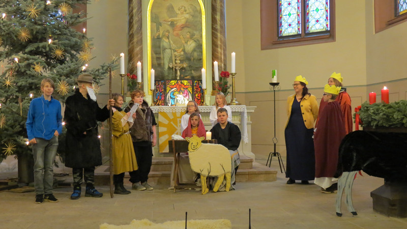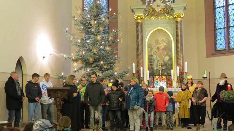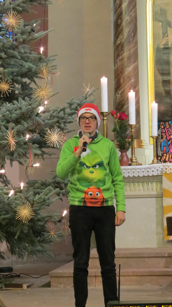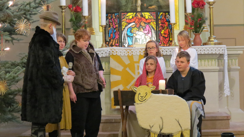In der anschließenden Andacht wurde der Gedanke aus dem Krippenspiel nochmals aufgegriffen. Es ging um das friedliche Miteinander aller und die Wertschätzung untereinander, egal ob arm oder reich, alt oder jung, hübsch oder nicht so hübsch, dünn oder rundlich, egal welches Geschlecht oder welche Religion. So füllte sich die Bühne zu einem schönen Abschlussbild.