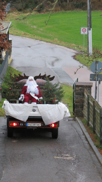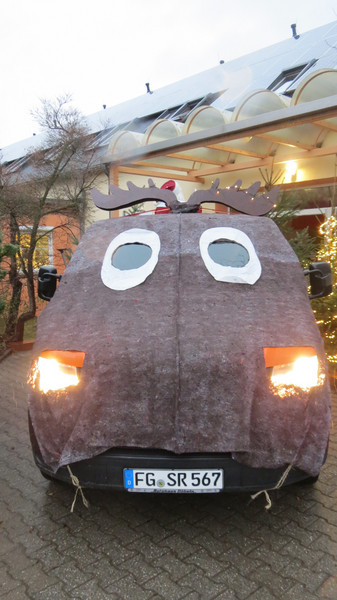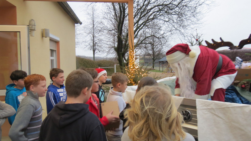 Traditionell besuchte uns wieder das Rentiermobil. Leider gab es statt Schnee diesmal nur Regen, so dass wir uns nicht alle auf dem Schulhof versammeln konnten. Unser überdachter Haupteingang bot den Schülern Schutz - nur dem armen Weihnachtsmann nicht.