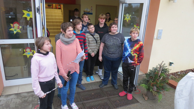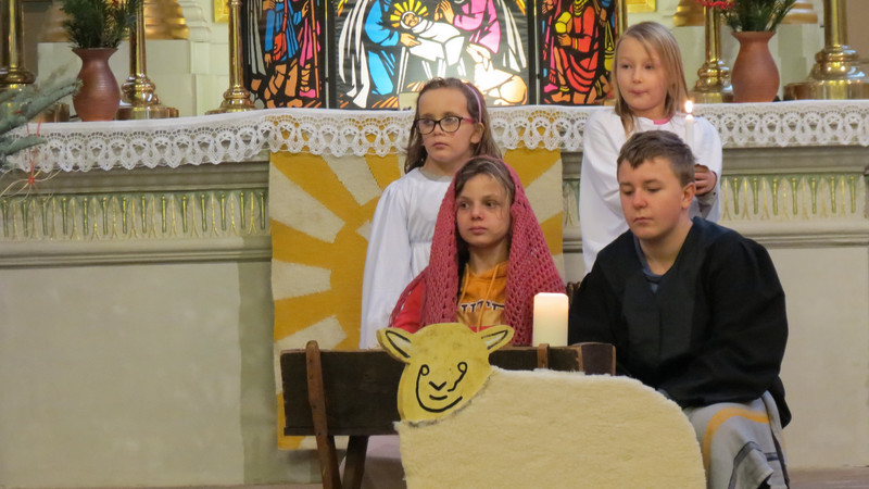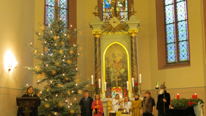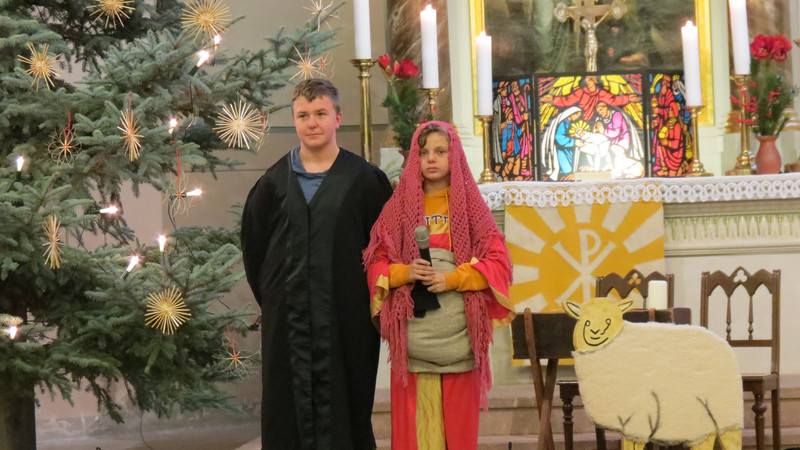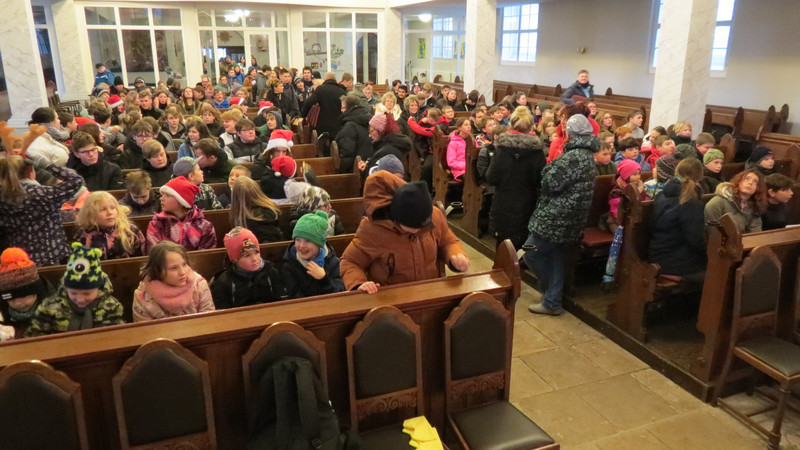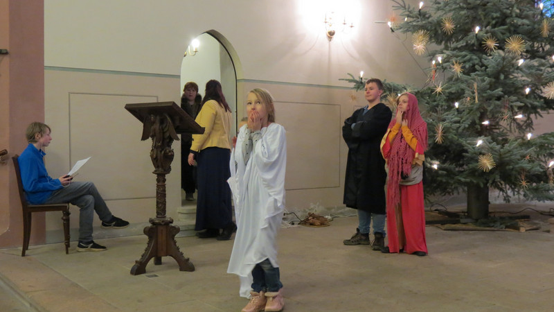 Nach der Weihnachtsüberraschung liefen die Schüler gemeinsam mit ihren Lehrern zur Roßweiner Kirche. Fleißig hatten die Schüler der Ganztagsgruppe "Theater" unter Leitung von Frau Palme geprobt, um traditionell das Krippenspiel aufzuführen. Gäste waren außer uns Eltern, Familienmitglieder, Bürger aus Roßwein sowie aus der Behindertenwerkstatt. Somit war die Kirche gut gefüllt!