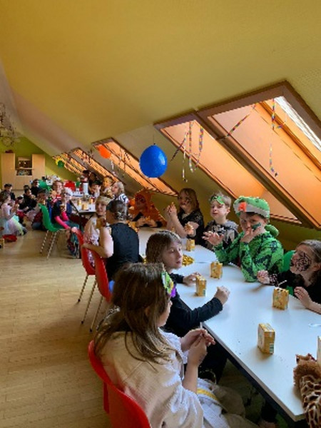 An verschiedenen Stationen wurde getanzt, gespielt, gesungen und geschminkt. Mit zünftiger Stimmungsmusik zogen alle mit einer Polonaise durchr‘s Schulhaus und verbreiteten so auch bei allen anderen Schülern gut Laune.