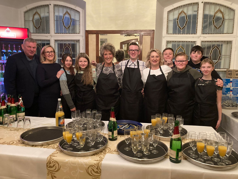 Zu solch einem Empfang gehört natürlich auch eine kulinarische Versorgung. Ein großes Lob und Dankeschön geht deshalb an die Schülerinnen und Schüler unserer Schule, die dafür sorgten, dass (fast) keine Wünsche offen blieben! Sie versorgten die Gäste mit Freundlichkeit und vollem Einsatz mit Getränken. Dafür ernteten sie viel Lob und Anerkennung der Gäste! Unterstützt wurden sie dabei von W. Mothes und U. Eisner.