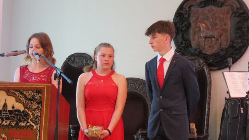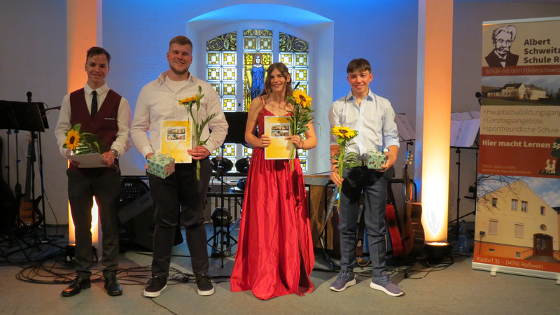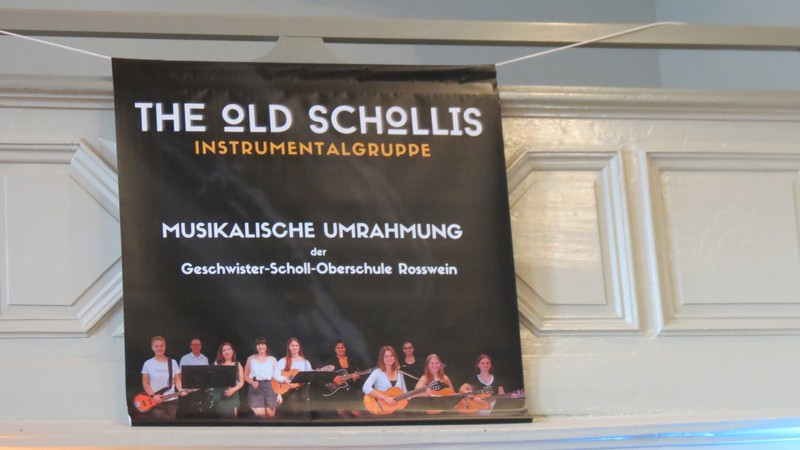 Während die Gäste im großen Rathaussaal ihre Plätze einnahmen, wurden die Noch-Schüler mit festlicher Musik vom Balkon des Rathauses begrüßt. Dafür danken wir dem Posaunenchor Roßwein herzlich! Begleitet von ihren Klassenlehrerinnen und dem Song „Komet“ schritten die Jugendlichen durch das Spalier der Gäste zu ihren Plätzen. Zwei weitere Lieder der Gesangs- und Instrumentalgruppe „The old Schollis“ ließen alle etwas zur Ruhe kommen. Unser Dank geht an die jungen Leute, die unsere Feierstunde musikalisch begleiteten.