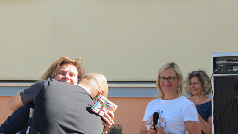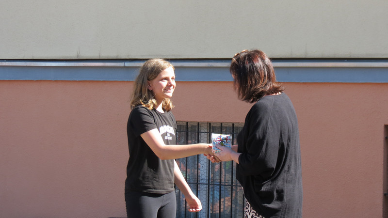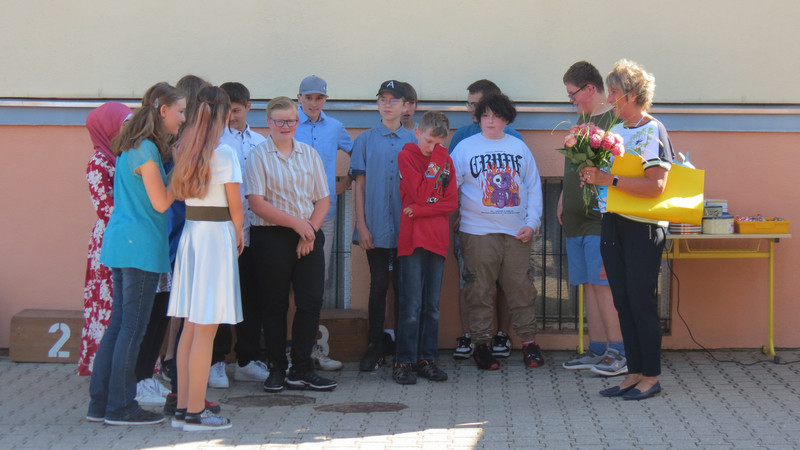 Nun wurde es aber endlich Zeit für die Abschlusszeugnisse. Zu jedem aufgerufenen Schüler gab es noch ein paar begleitende Worte. Mit ihrem Zeugnis, einer Sonnenblume und einem liebevoll verpackten Geschenk nahmen die Jugendlichen wieder ihre Plätze ein.
