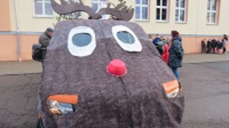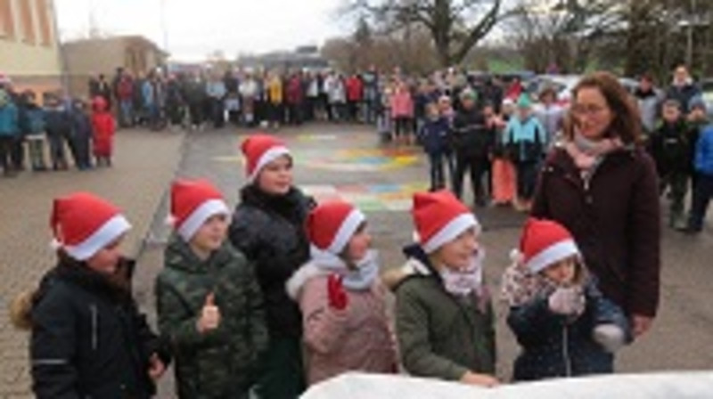 Viele Klassen begannen den Tag mit einem gemeinsamen weihnachtlichen Frühstück, bevor wir uns alle auf dem Schulhof versammelten. Einer nun schon schönen Tradition folgend erwarteten wie den Weihnachtsmann mit seinem Rentiermobil. Zum Glück kam er nicht mit dem Schlitten, denn der Schnee, der uns eine Woche lang erfreute, war leider wieder weggetaut. Mit kleinen Liedern, Gedichten oder einem Tänzchen erfreuten die Schüler den Weihnachtsmann und alle Anwesenden. Zur Belohnung erhielt jede Klasse eine Geschenketüte.