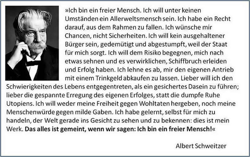 Und natürlich hatte Albert Schweitzer schnell erkannt, dass wir alle Verantwortung übernehmen müssen und unser eigenes Handeln am Ende darüber entscheidet, ob wir Gutes oder Böses hinterlassen.