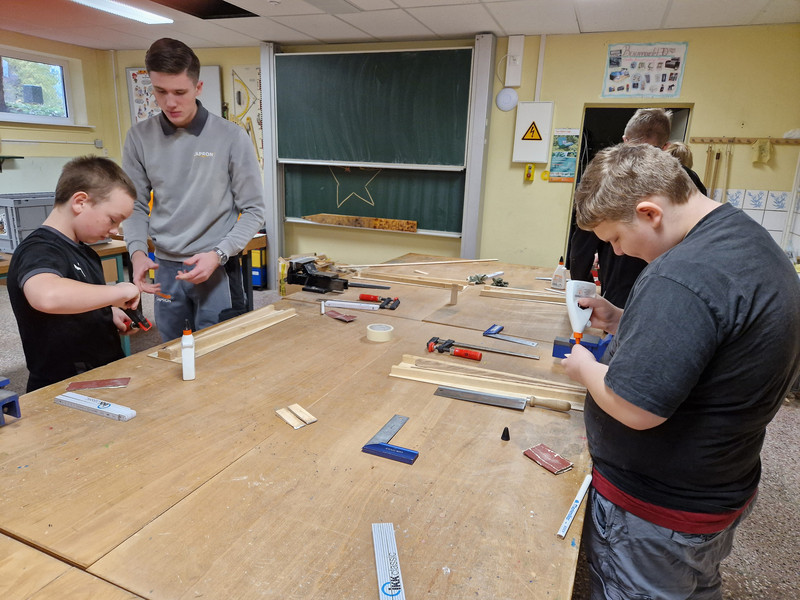 Am 27.10.25 konnten wir fünf Gewerke in unserer Einrichtung begrüßen und getreu dem Motto „Tannert meets Wirtschaft“ berufliche Praxis in die Schule holen. Schülerinnen und Schüler der 6. Klasse durften an den 5 Stationen selbst ausprobieren, wie man mit Schablonen eine Wand verschönern, passgenau Löcher in ein Aluminiumblech bohren oder mit wenigen Mitteln eine praktische Grillzange herstellen kann. An jeder Station erhielten die Lernenden einen Stempel auf ihre Urkunde, die zum Ende mit einem Foto versehen wurde. Die handgefertigten Modelle und den Titel „Handwerker der Zukunft“ als Erinnerung an den Tag durften sie mit nach Hause nehmen. Begleitet wurde das Ganze von Auszubildenden und Meistern, die aus ihrem Berufsalltag berichteten. Das Projekt zeigte, dass das Handwerk nicht nur Tradition, sondern auch für Förderschüler eine echte Perspektive bedeutet. Die Schülerinnen und Schüler waren mächtig stolz auf Ihre Leistungen und bedanken sich recht herzlich bei den anwesenden Handwerkern.