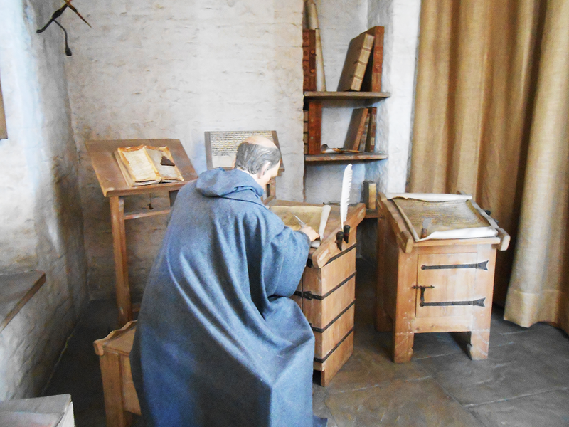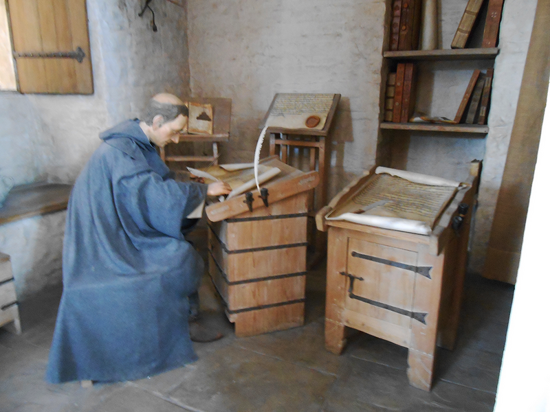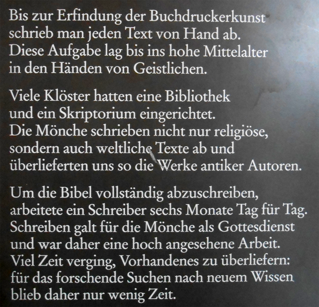 Hier eine Abbildung mit der Nachgestaltung eines Skriptoriums aus dem Deutschen Museum in München und der dazugehörigen Schautafel.