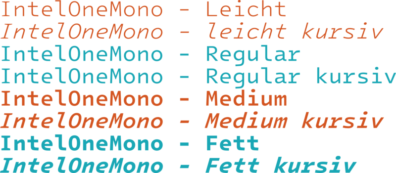 Trotz der gleichen Buchstabenbreite haben die Schriftentwickler großen Wert auf gute Lesbarkeit gelegt. Aber es wird noch besser. Die IntelOneMono-Schriften gibt es in vier Schriftschnitten – Leicht, Regular, Medium und Fett – mit passenden Kursiven. Das bedeutet, dass man die Arbeitsmaterialen für Programmiercode auch gut und variable gestalten kann.