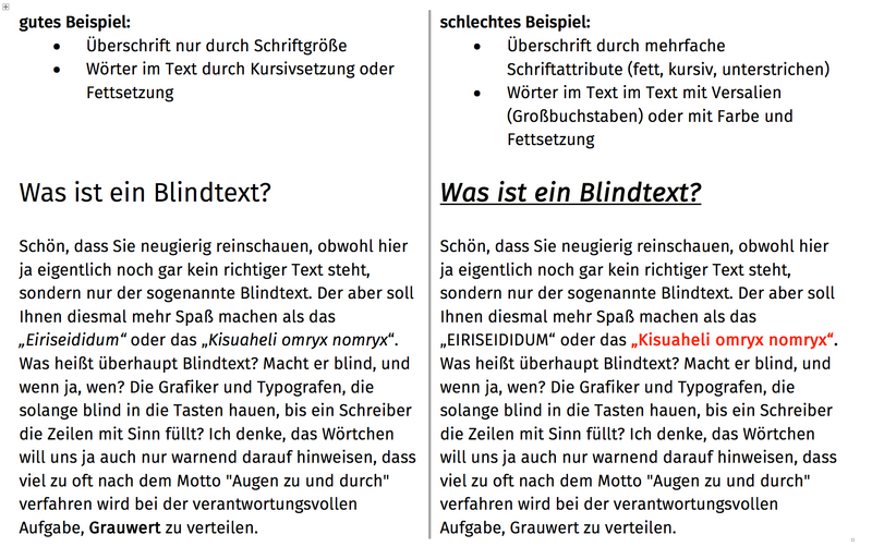 - Hervorhebungen sollten nie durch Setzen in Versalien (Text nur in Großbuchstaben) oder Unterstreichungen erfolgen.