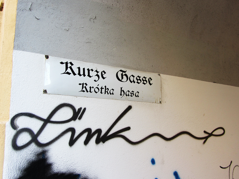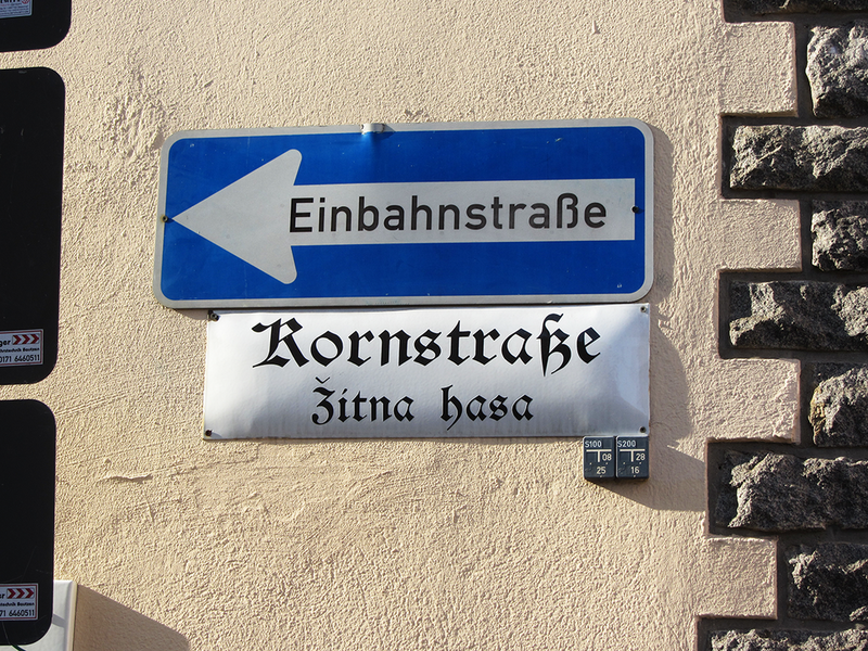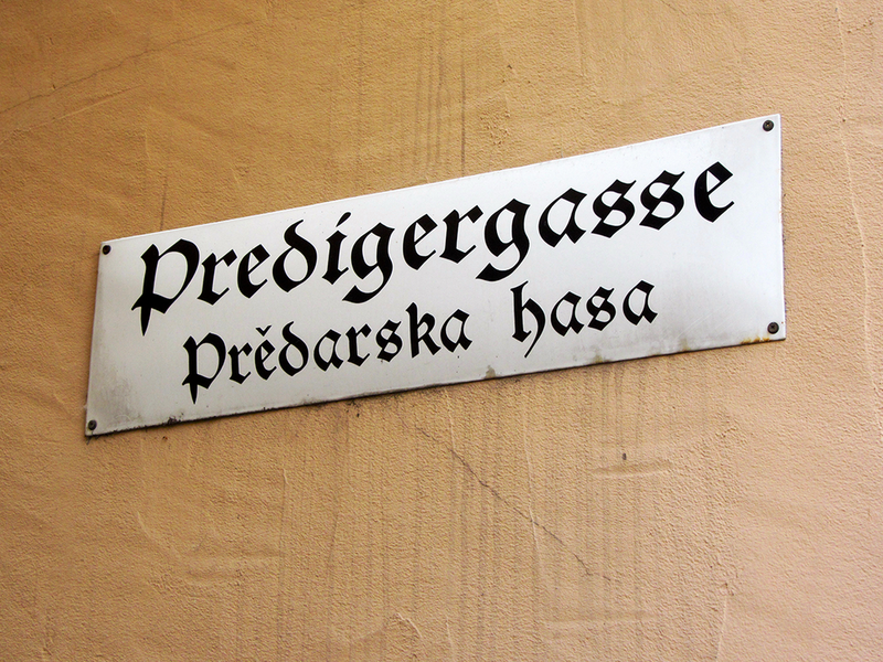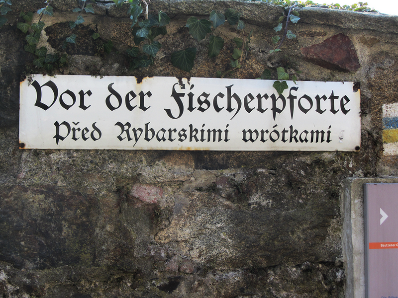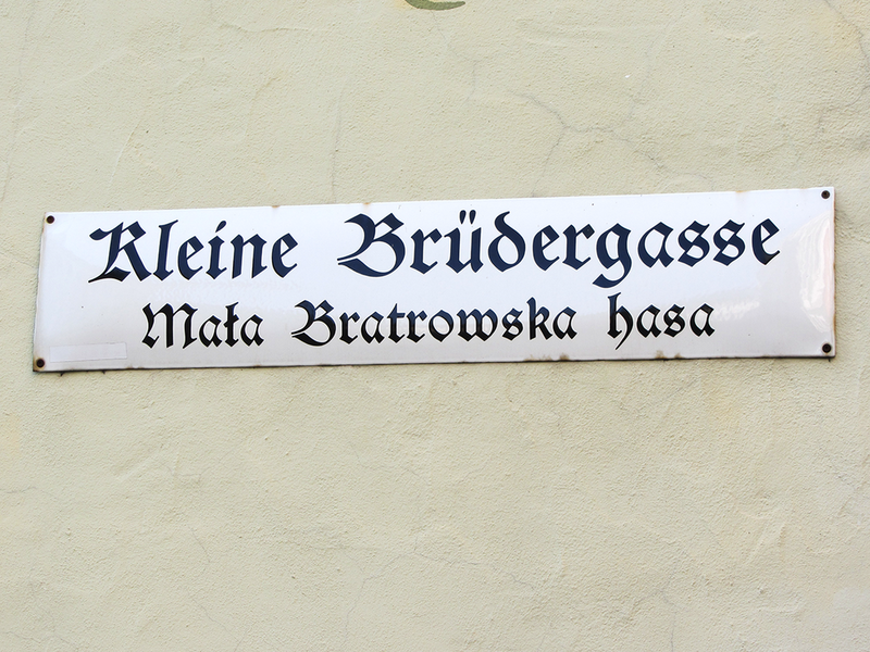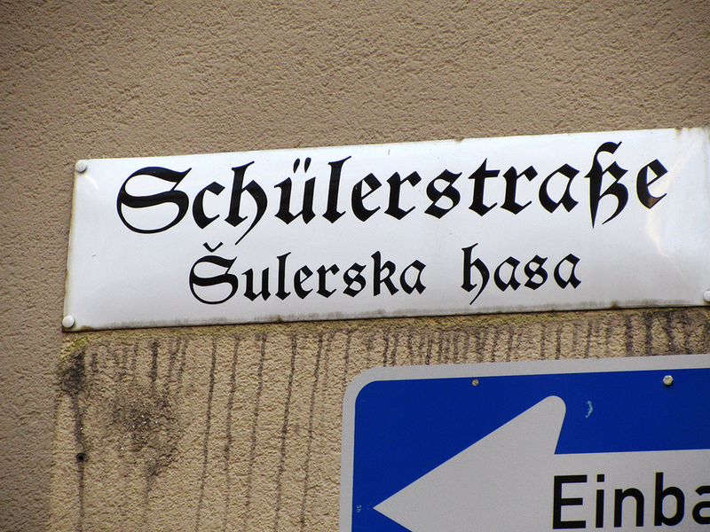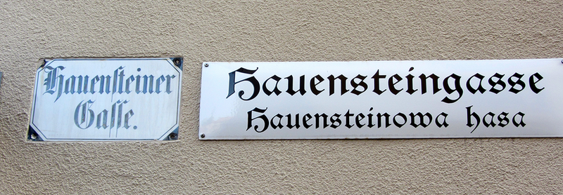 In Bautzen sind die Schilder in einer relativ fetten Fraktur gesetzt, die leider ohne die Verwendung des in der Fraktur typischen langen s-Lautes daher kommt. Viele Straßenschilder sind als Besonderheit zweisprachig – in deutsch und sorbisch.