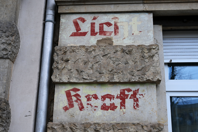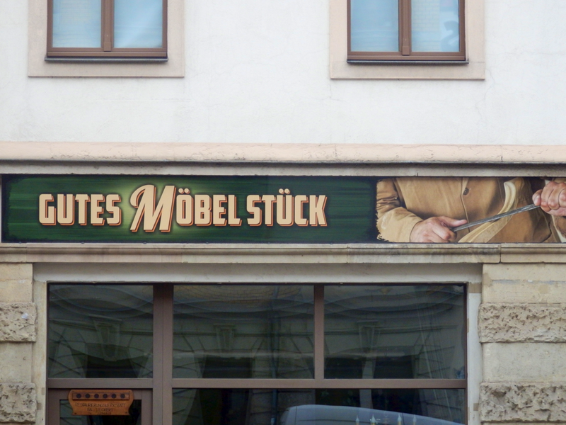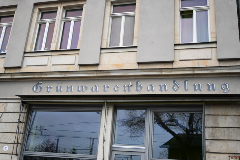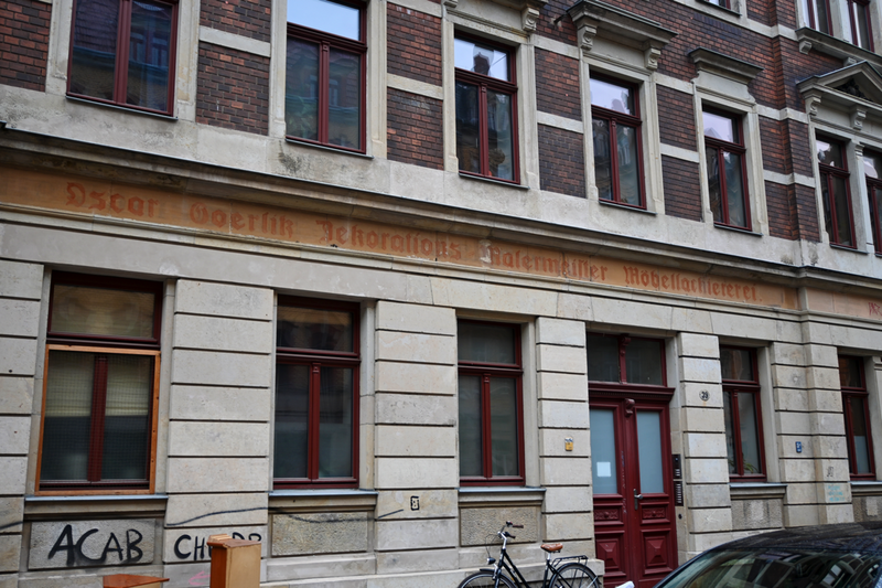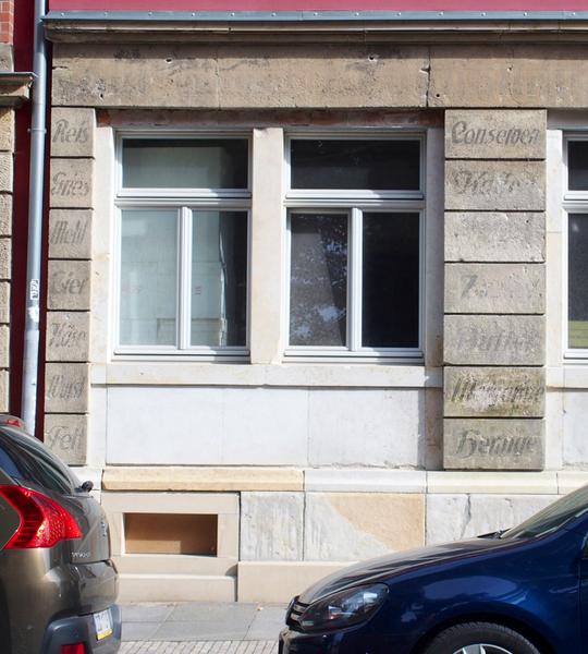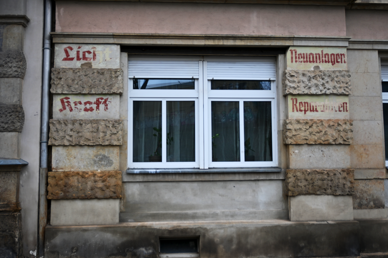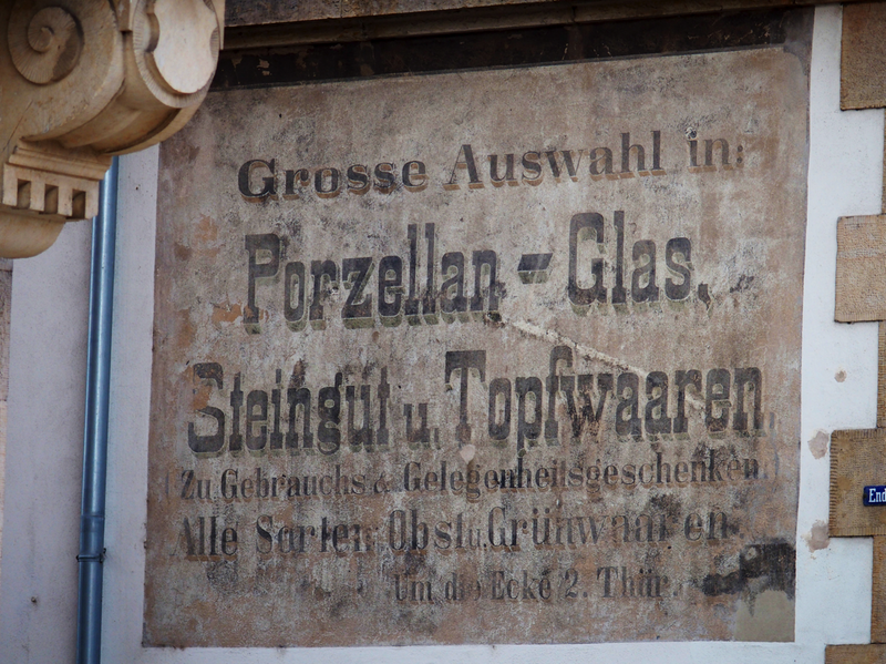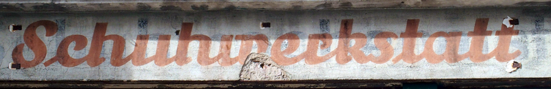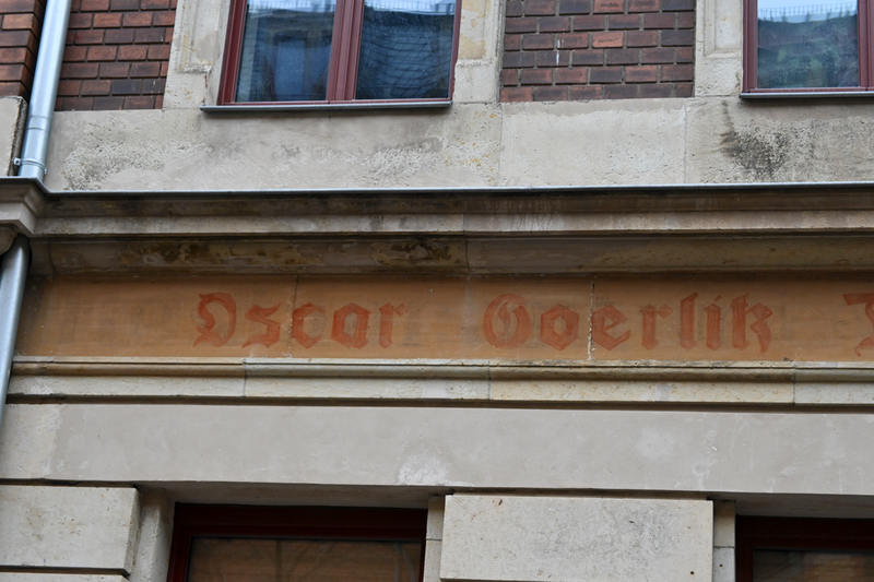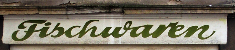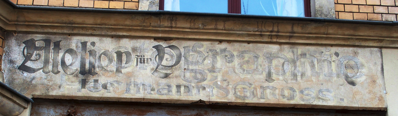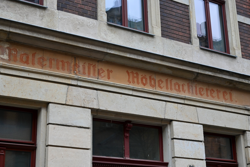 Gemalte Schilder waren im 19. und 20. Jahrhundert die gängigste und häufigste Beschriftungsform von Geschäften, Firmen und Einrichtungen. Den Beruf des Schildermalers kann man auch heute noch erlernen. Teilweise findet man noch die schönen, alten Beschriftungen an Häusern. Dabei kamen meist Schreibschriften (wie bei den Beschriftungen „Fischwaren” und „Schuhwerkstatt”) oder auch gebrochene Schriften (z.B. bei den Beschriftungen zum Lampen- und Lichtgeschäft und der Möbellackiererei Oscar Goerlitz) zum Einsatz. Typisch waren auch die senkrechten Beschriftungen neben Eingangstüren oder Schaufenstern. Aber auch gemalte Werbeschilder befanden sich oft an Hauswänden (siehe Werbung „Uniformkragen” oder „Porzellan”).
