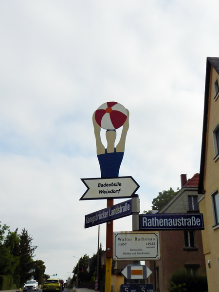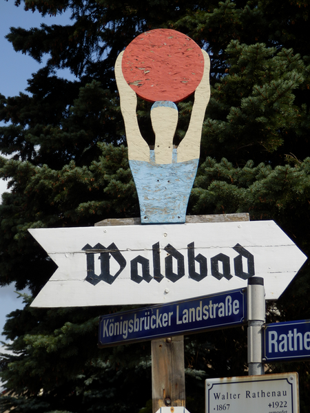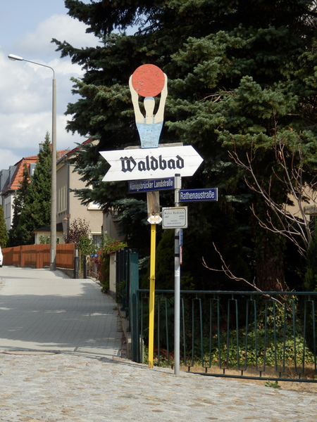 Seit vielen Jahren fahre ich auf der Königsbrücker Landstraße durch Weixdorf zu meiner Arbeitsstelle. Auf Höhe der Rathausstraße erfreut mich seit langer Zeit das schöne alte Waldbadschild. Ein handgemachtes und gemaltes Schild mit dem Hinweis „Waldbad” in einer schönen alten gotischen Texturschrift. Ein richtiges kleines typografisches Schmuckstück.