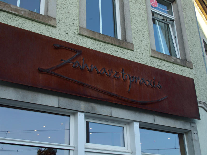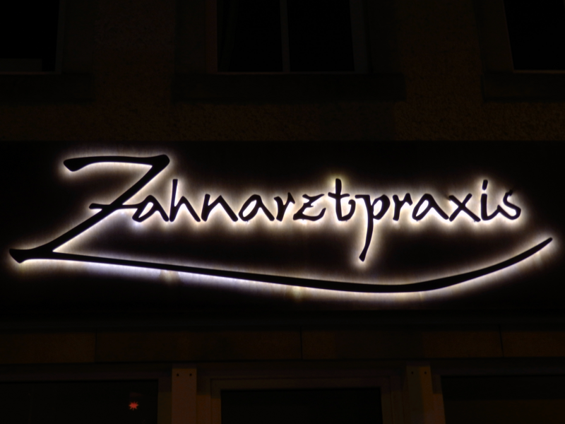 Zum Schluss noch einige Beispiel für Leuchtschriften, bei denen durch Hintergrundbeleuchtung die Information hervorgehoben wird. Das erste Beispiel – das Zahnarztpraxisschild – ist schon bei Licht super schön mit seiner Rostoptik und der extravaganten Scriptschrift.