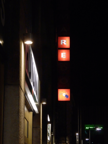 Lustig finde ich immer Leuchtschriften mit Fehlern, d. h. mit ausgefallenen Buchstaben. Wie bei der Leuchtschrift für die Steakhouse-Kette MAREDO. :)