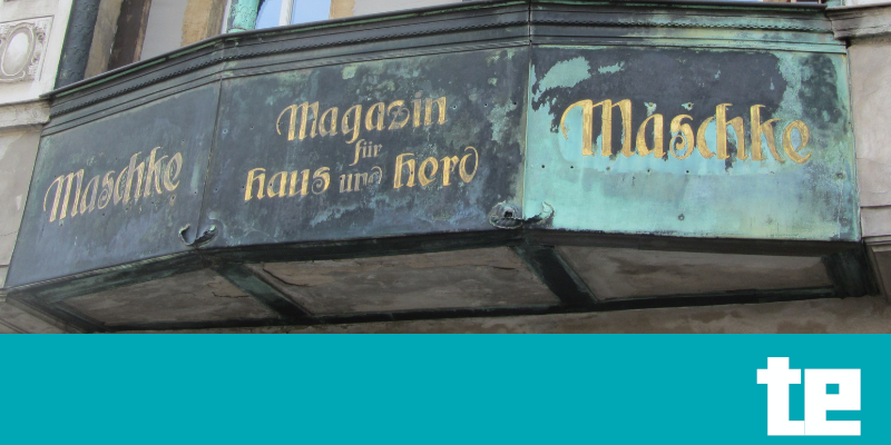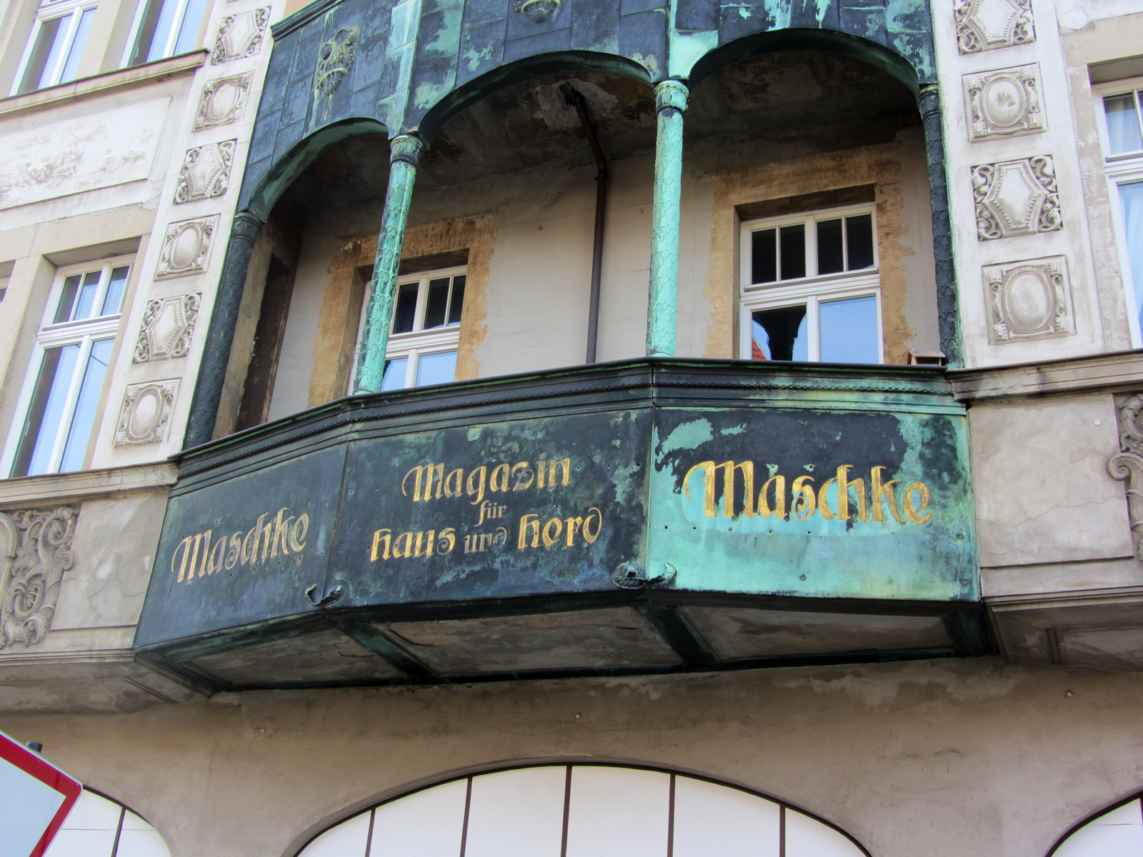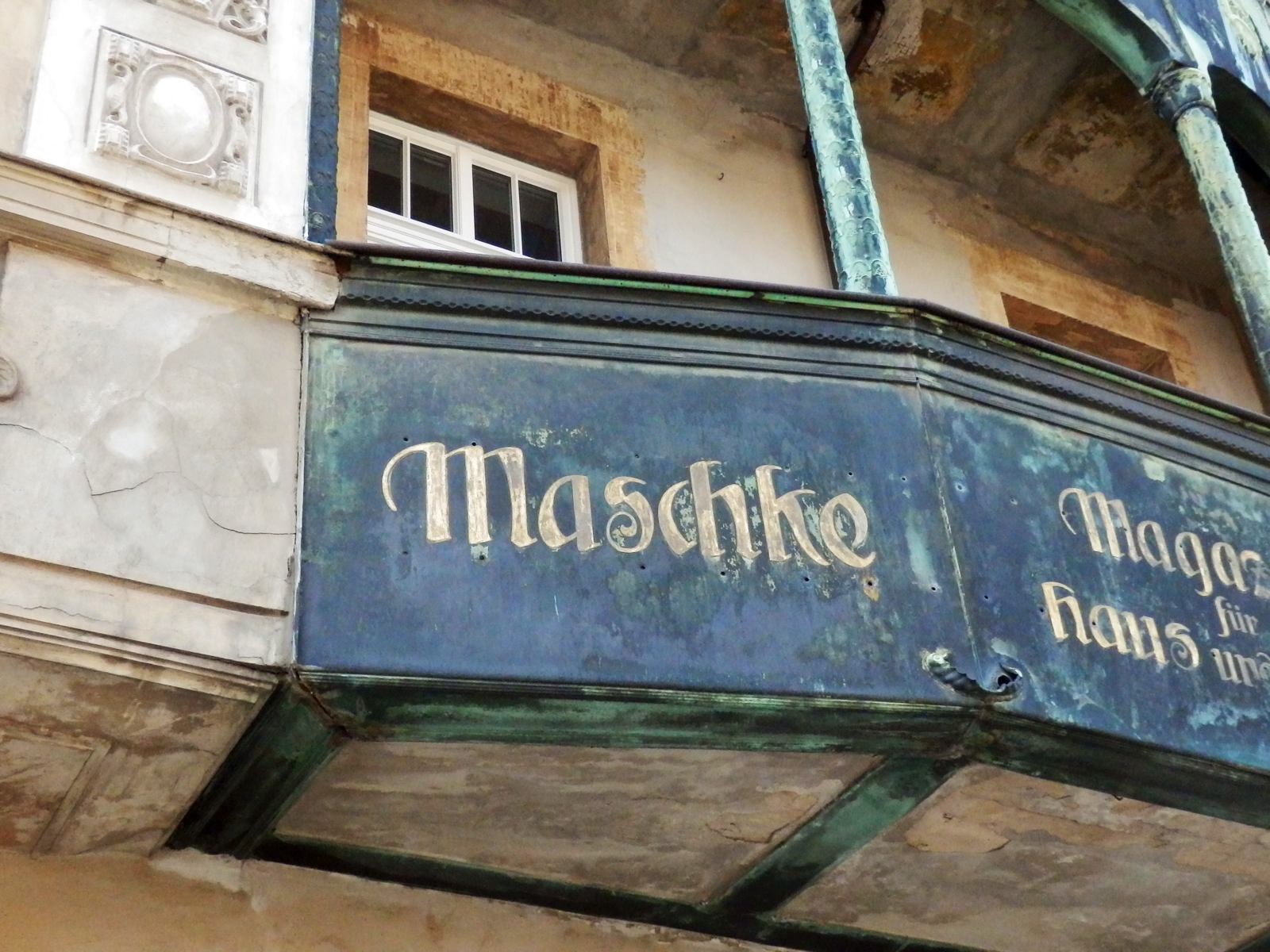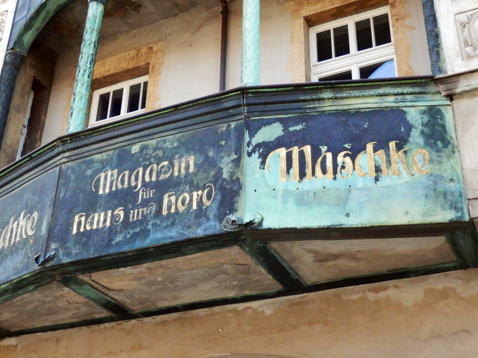 Im Dresdner Stadtteil „Weißer Hirsch” steht an der Bautzner Straße ein altes Haus mit einem typografisch geschichtsträchtigen Balkon. Dort ist eine alte Geschäftsbeschriftung der Firma Maschke für eine Geschäft mit der Bezeichnung „Magazin für Haus und Herd” zu bewundern. Das „Bewundern” ist dabei ganz ernst gemein. Der Balkon ist wahrscheinlich mit Kupferblech verkleidet (Hinweis dafür ist die Grünspan-Patina) und die Firma und der Name in einer goldenen Jugendstilschrift. Die Beschriftung ist ein wirkliches typografisches Schmuckstück.