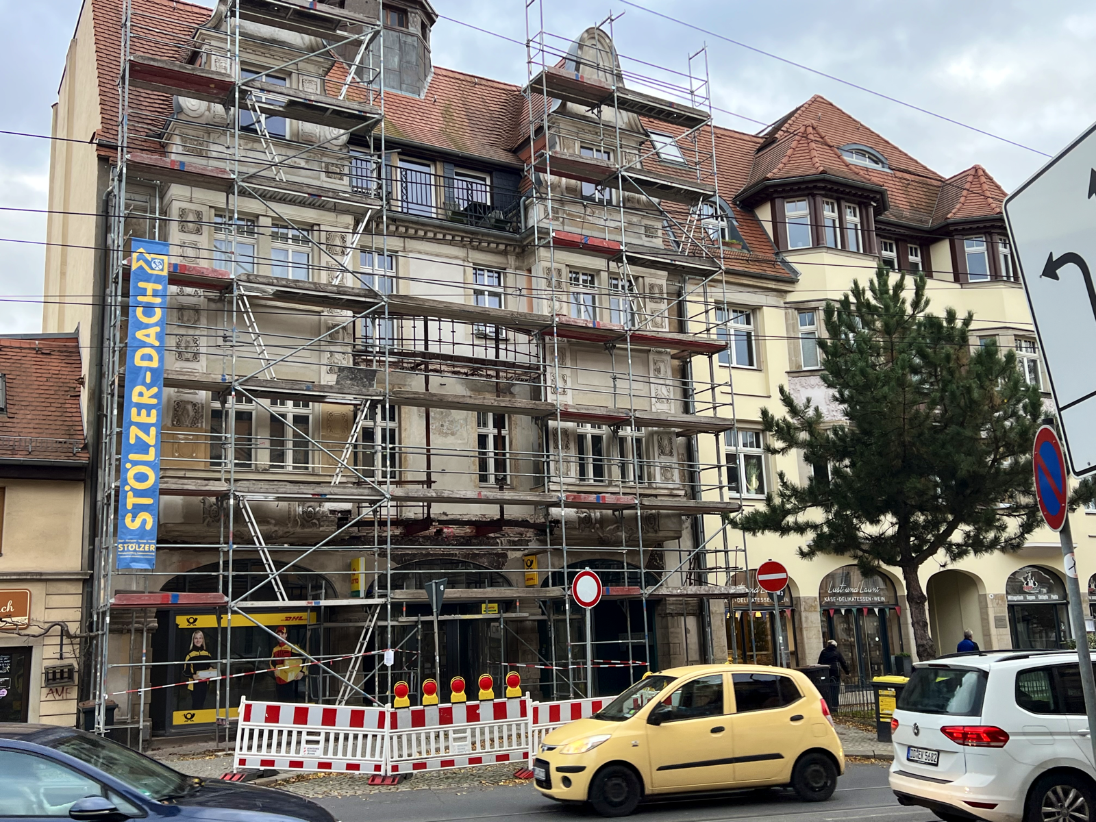 Nun wird das Gebäude saniert und der Balkon ist abgebaut. Es ist wirklich zu hoffen, dass auch der Balkon restauriert wird und dann wieder in neuer Pracht an Ort und Stelle installiert wird.