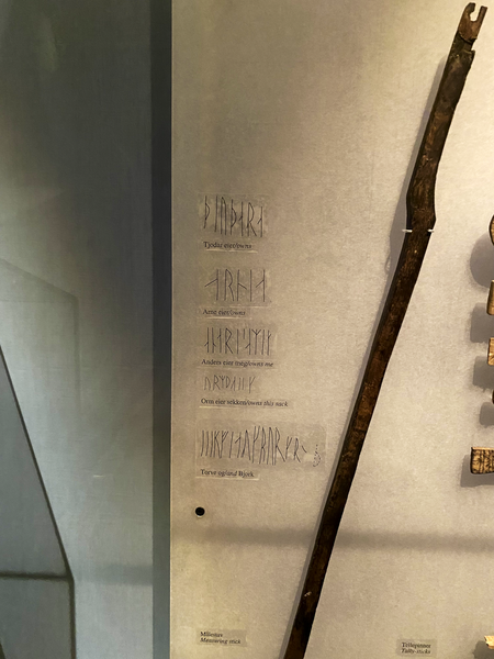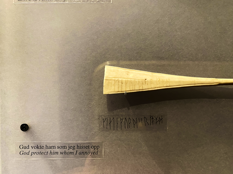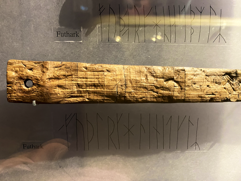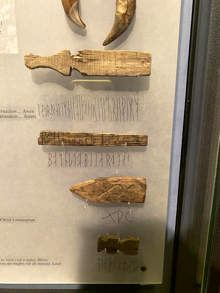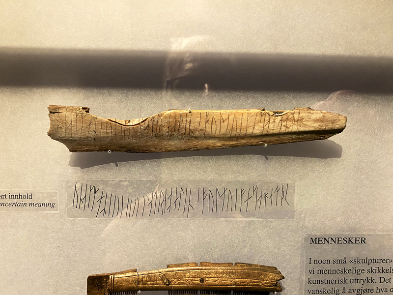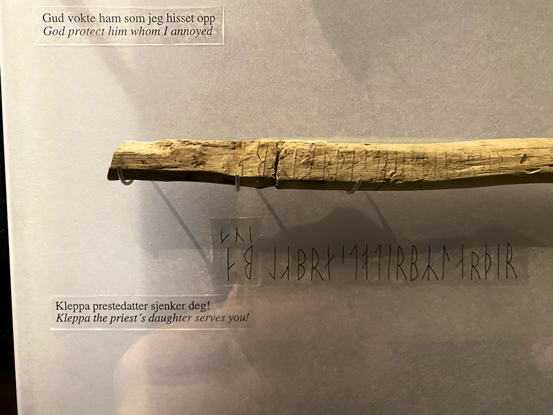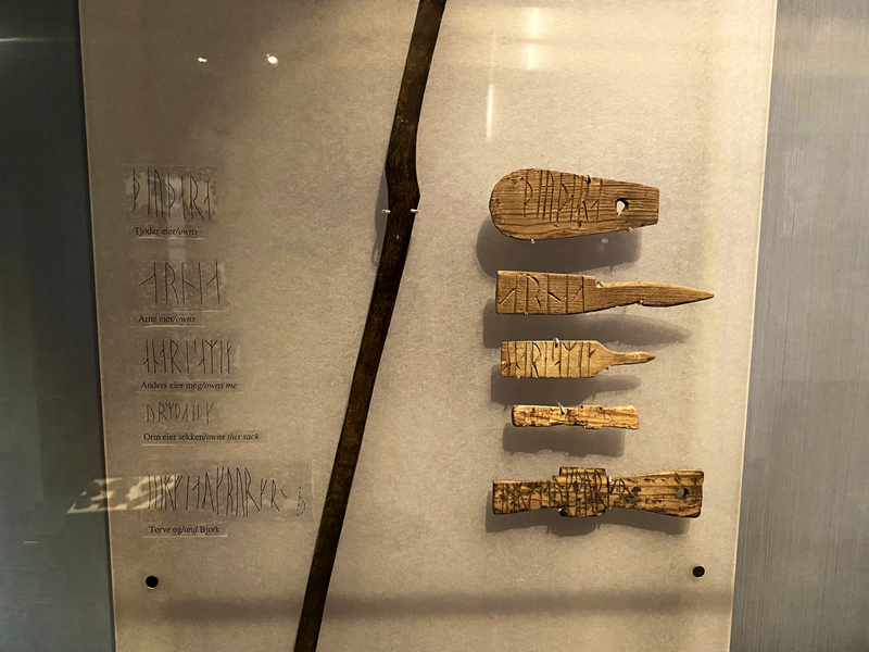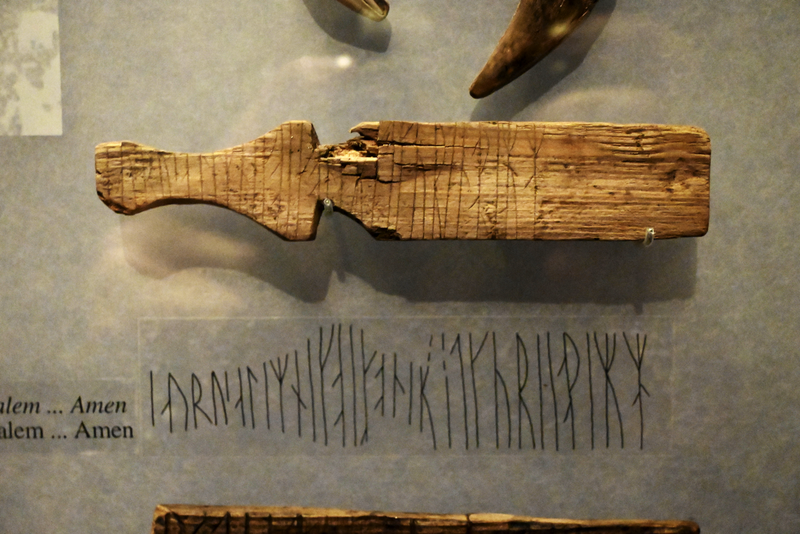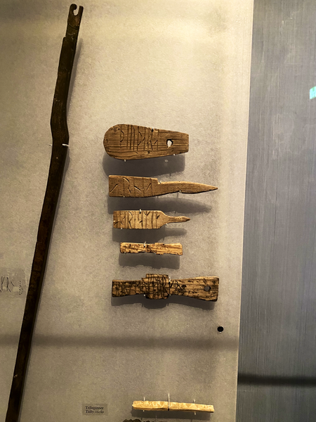 Erstaunlicherweise hatte ich nicht damit gerechnet, dass ich neben den Runen auf dem Kuli-Stein noch ganz viele andere Runeninschriften zu sehen bekam. Eigentlich befinden sich heute Runeninschriften vorwiegend auf Steinen (sogenannte Runensteinen). Die meisten bekannte Runen-Steine stehen in Dänemark und Schweden. Eher selten sind Runeninschriften auf Holz und Knochen. Dies ist durch die natürliche Verwitterung und Zersetzung dieser alten Schriftdokumente gegeben. Um so erstaunter war ich, dass im Museum von Trondheim so zahlreiche Runeninschriften auf Holz und Knochen zu sehen waren.